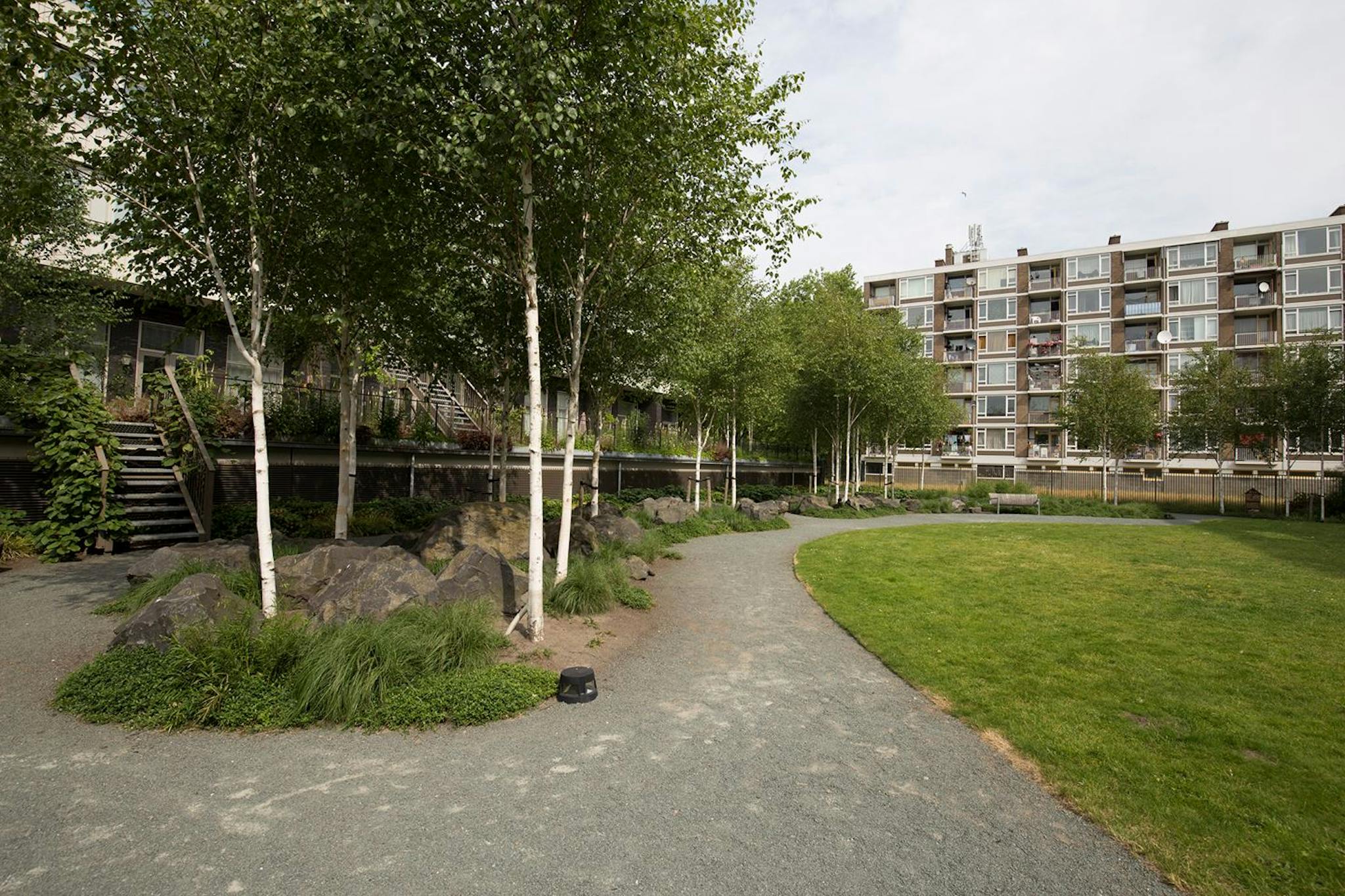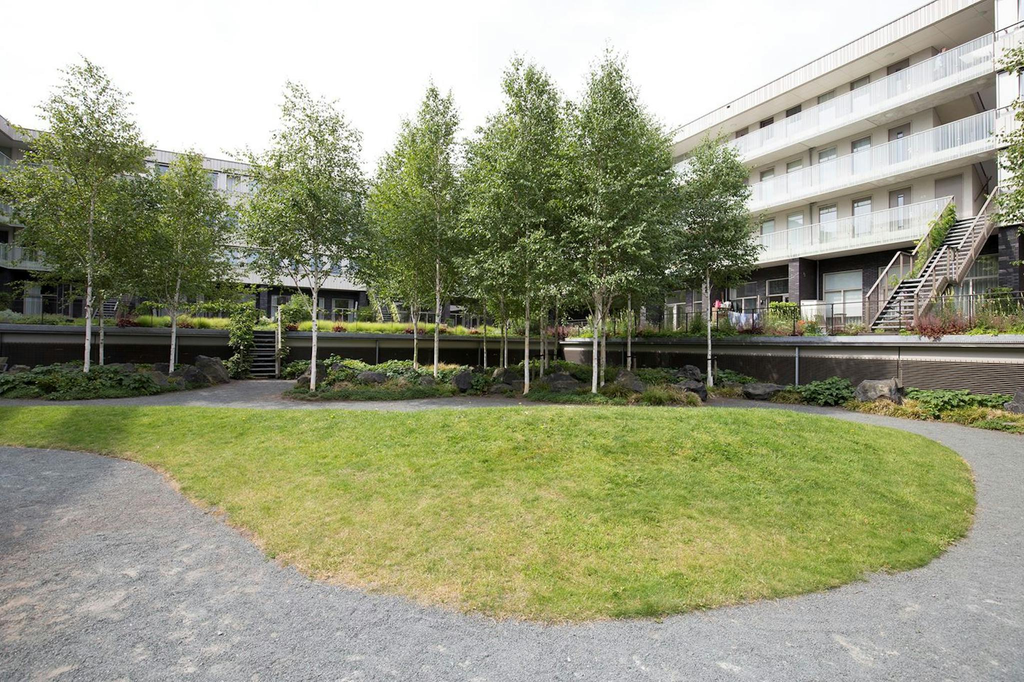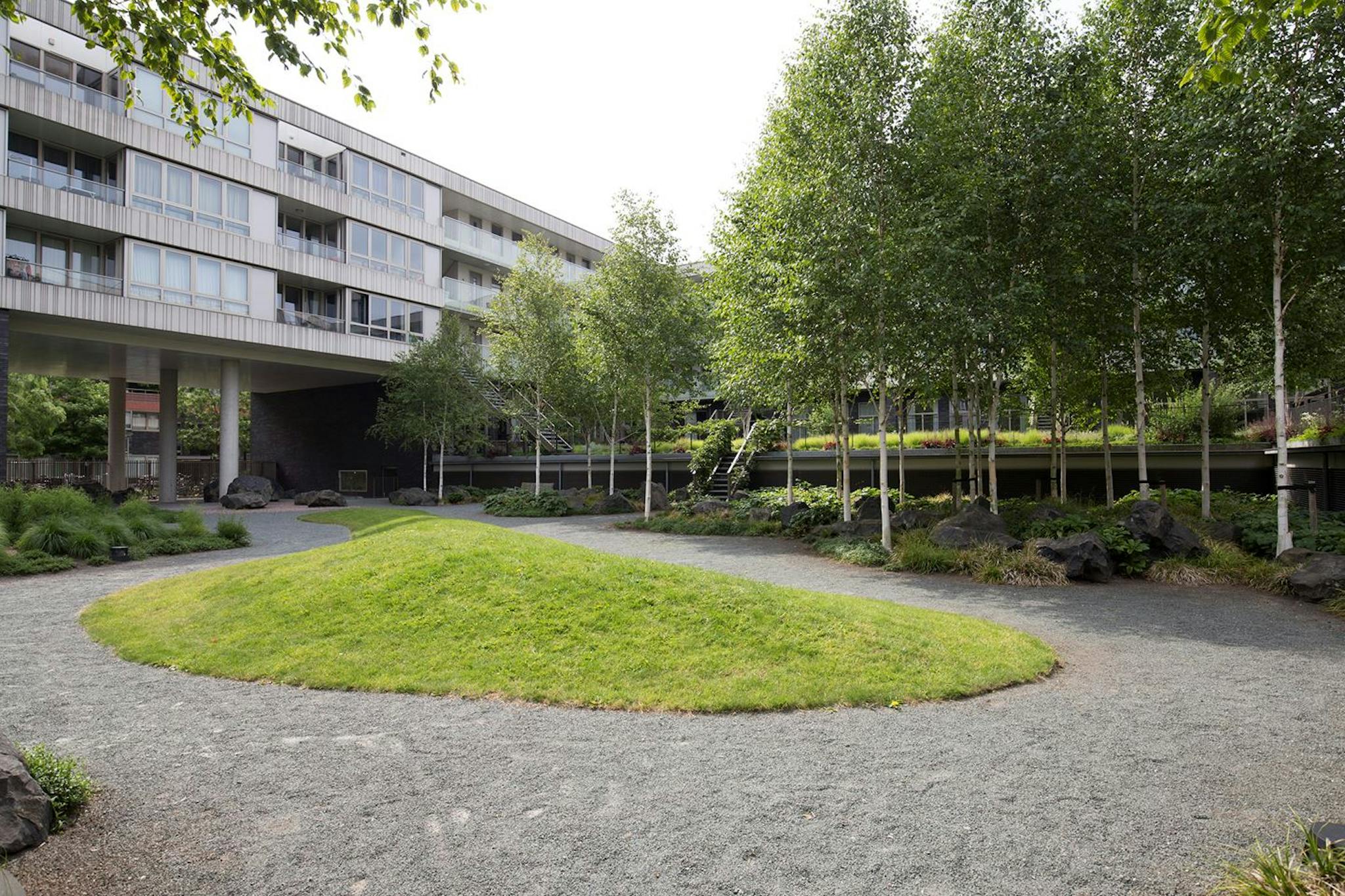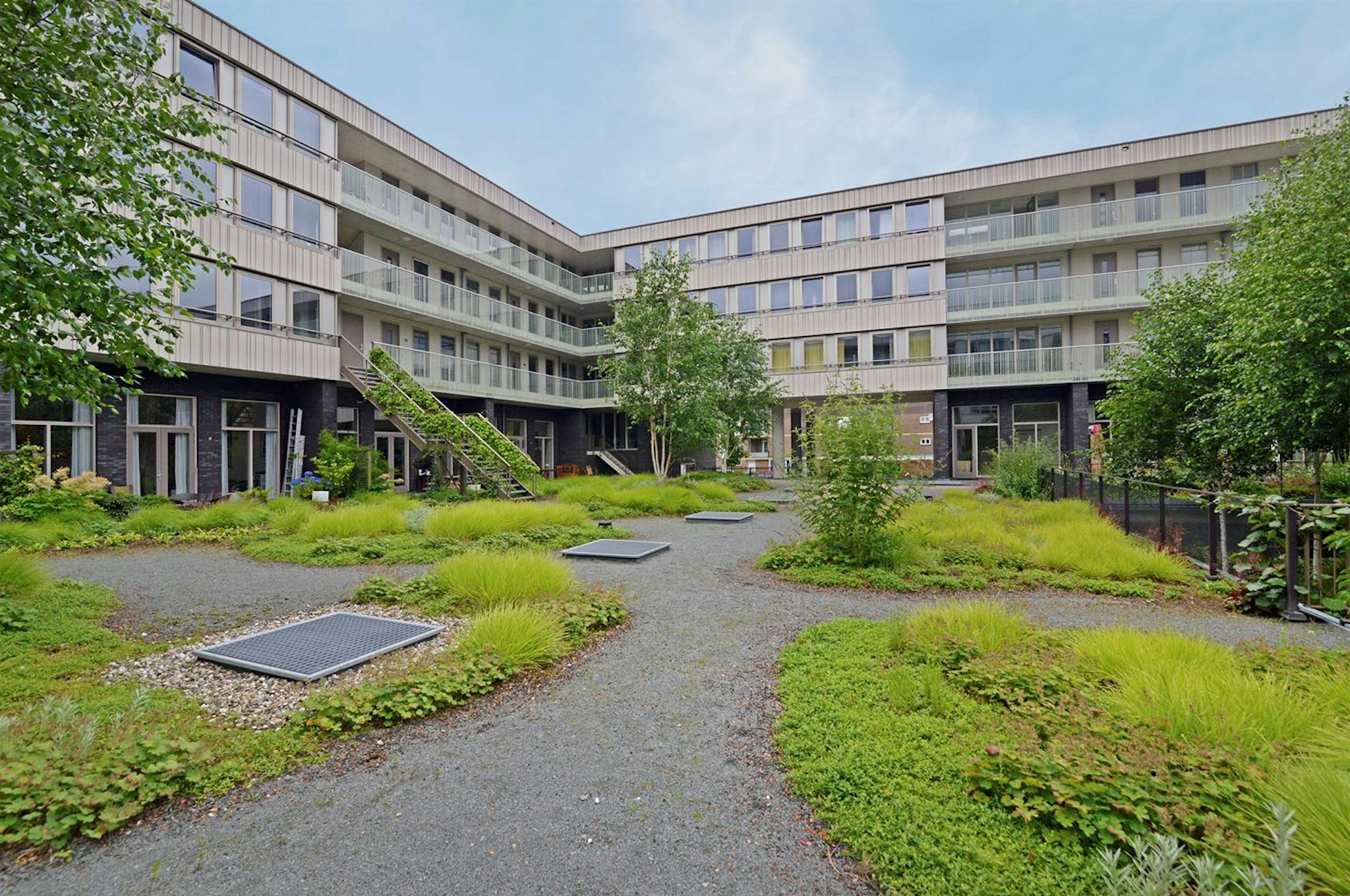 Secure apartment complex with shared green garden