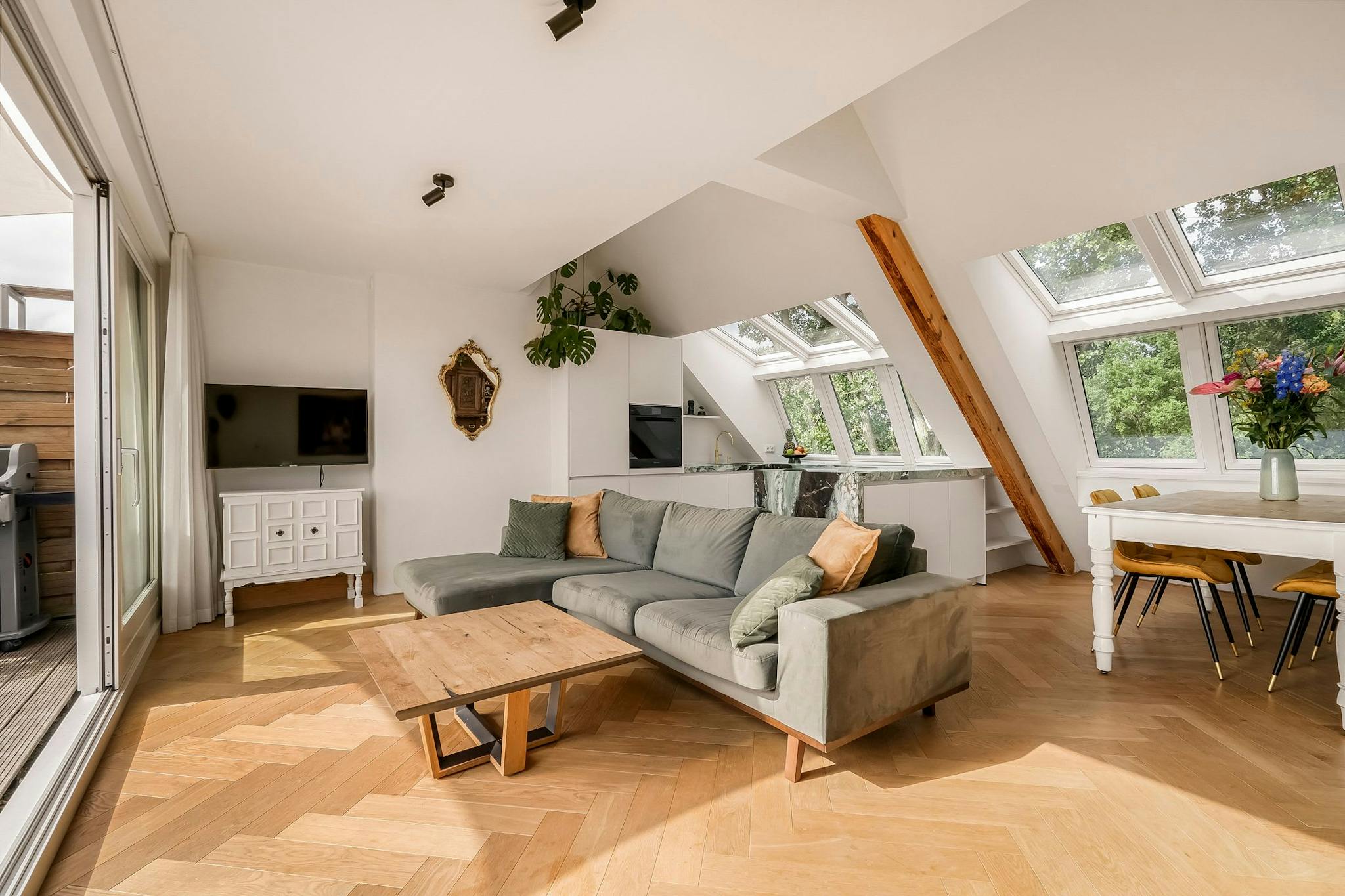 Non-SmokingNot allowedLiving by Rembrandtpark, with a grassy field and canal right out front – this spacious double upper-level apartment with two terraces and three bedrooms offers the perfect blend of urban convenience and natural tranquility. Situated on a wonderfully quiet, peaceful street along the canal with unobstructed views of the green Rembrandtpark, this generous and bright double upper-floor apartment of approximately 91m2 provides a rare combination of comfort and charm. What's Included: Fully furnished throughout with quality pieces. Complete kitchen equipment and utensils. Fresh linen and towels provided. All cleaning supplies and equipment. High-speed internet connection. All utilities (gas, water, electricity) included. Flexible rental contracts available for temporary stays. Layout & Features. Spread over two levels, the home features three spacious bedrooms, two delightful terraces, and a comfortable open living area. Via the well-maintained communal stairwell, you reach the entrance on the third floor with a hallway featuring storage space and a staircase leading to the fourth floor. Third Floor: Three well-sized bedrooms (two with double beds ready for occupation, third bedroom versatile for use as baby room, office, or guest accommodation) Modern bathroom with bathtub, walk-in shower, and vanity unit. Separate toilet. Rear bedroom with direct access to sunny terrace through full-width sliding doors. Front bedroom includes cozy bay window lounge area with French windows overlooking water and park. Fourth Floor: The heart of the home features a bright and inviting living space with an open kitchen fitted with green marble and built-in appliances including Bora induction cooktop with integrated extractor, fridge, freezer, dishwasher, oven, gold Quooker tap, and large sink. Twelve exceptional skylights stretch across the full width of the room, offering stunning views of trees, water, and park. The rear features full-width sliding doors leading to the second spacious terrace with panoramic views across Amsterdam. Additional Features: Warm oak flooring throughout. Comfortable underfloor heating. Energy label A with solar panels and high-efficiency systems. Completely renovated in 2020/2021. Two full-width terraces. Mechanical ventilation system.