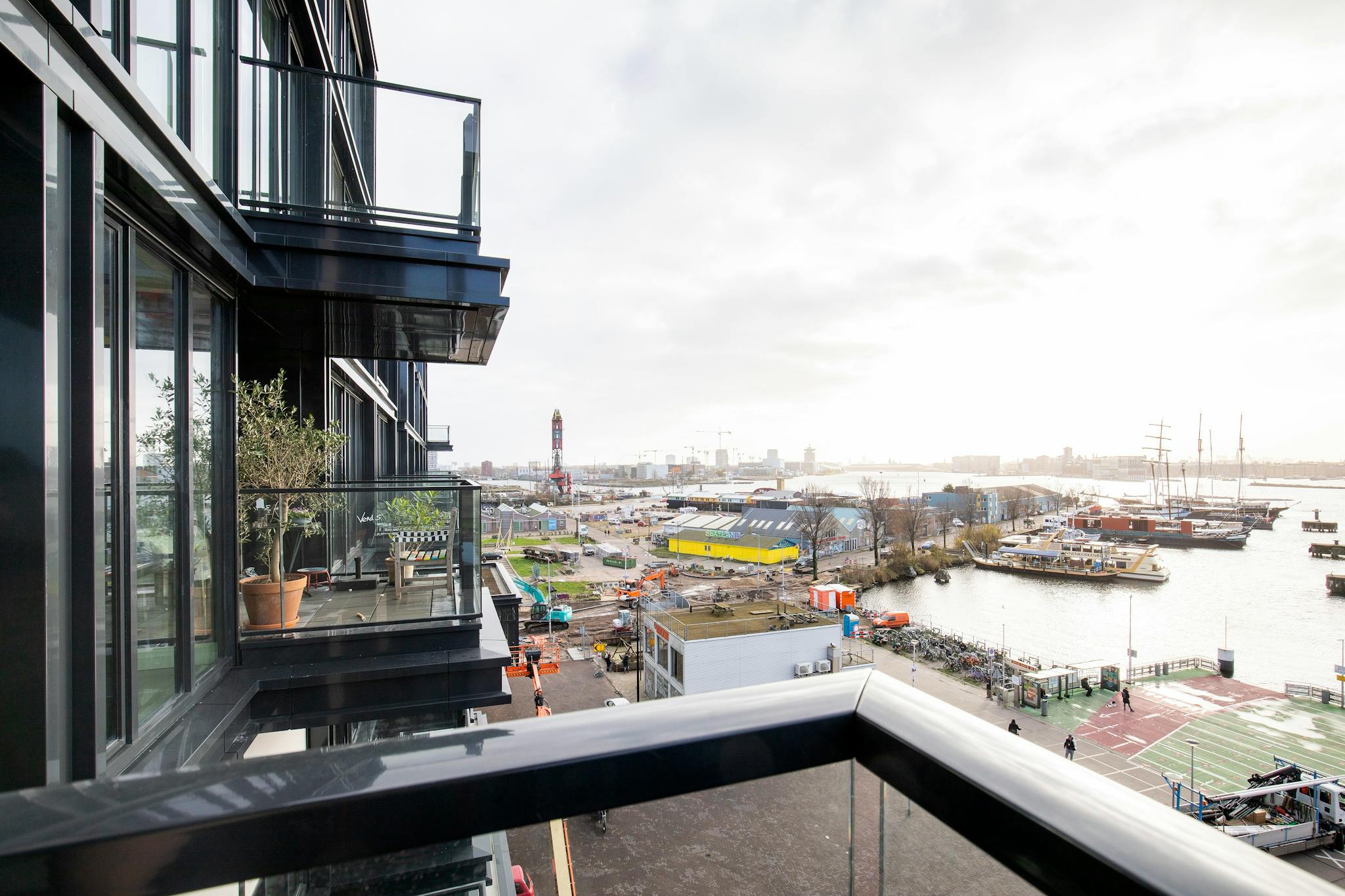 The bright, open-plan living area features large windows that frame the stunning waterfront and flood the space with natural light, and it opens onto a comfortable size balcony with views over ‘t IJ, perfect for relaxing or entertaining. The sleek, fully equipped kitchen with premium appliances is ideal for everything from casual meals to hosting.