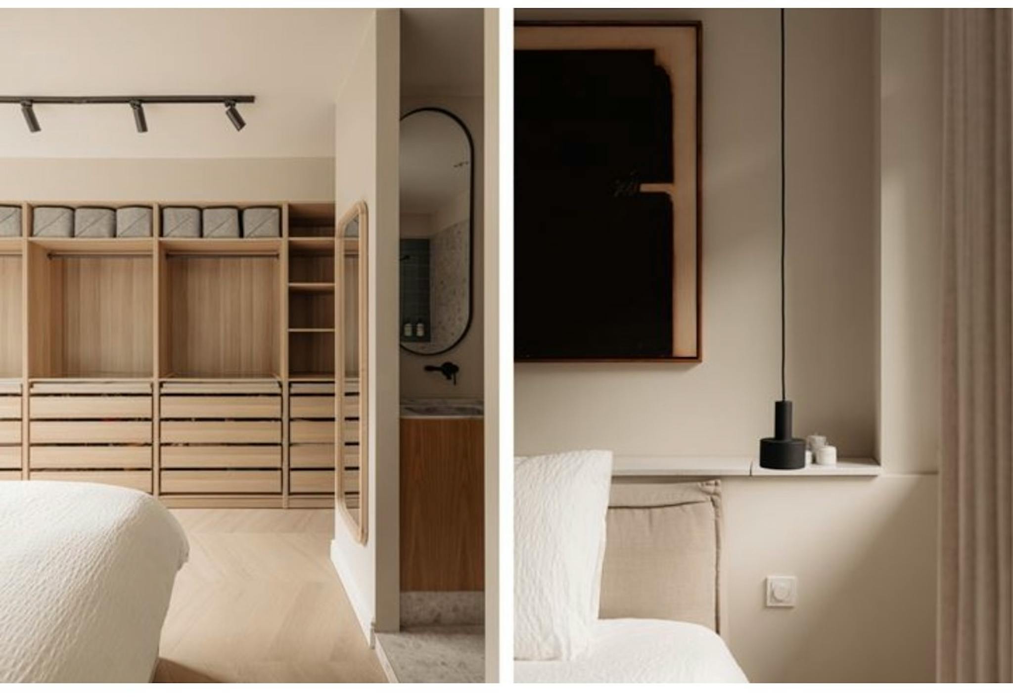 is fully equipped. The bedroom on the left has a built-in wardrobe and access to the balcony.