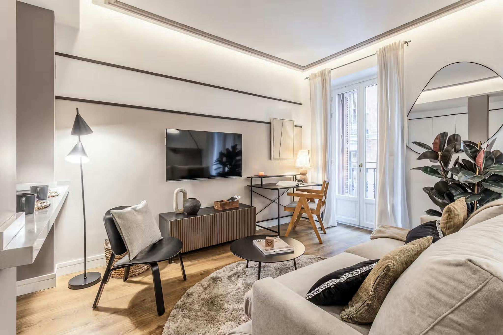 An open living area with large windows (canal light), a cozy seating area and smart TV for evenings in.