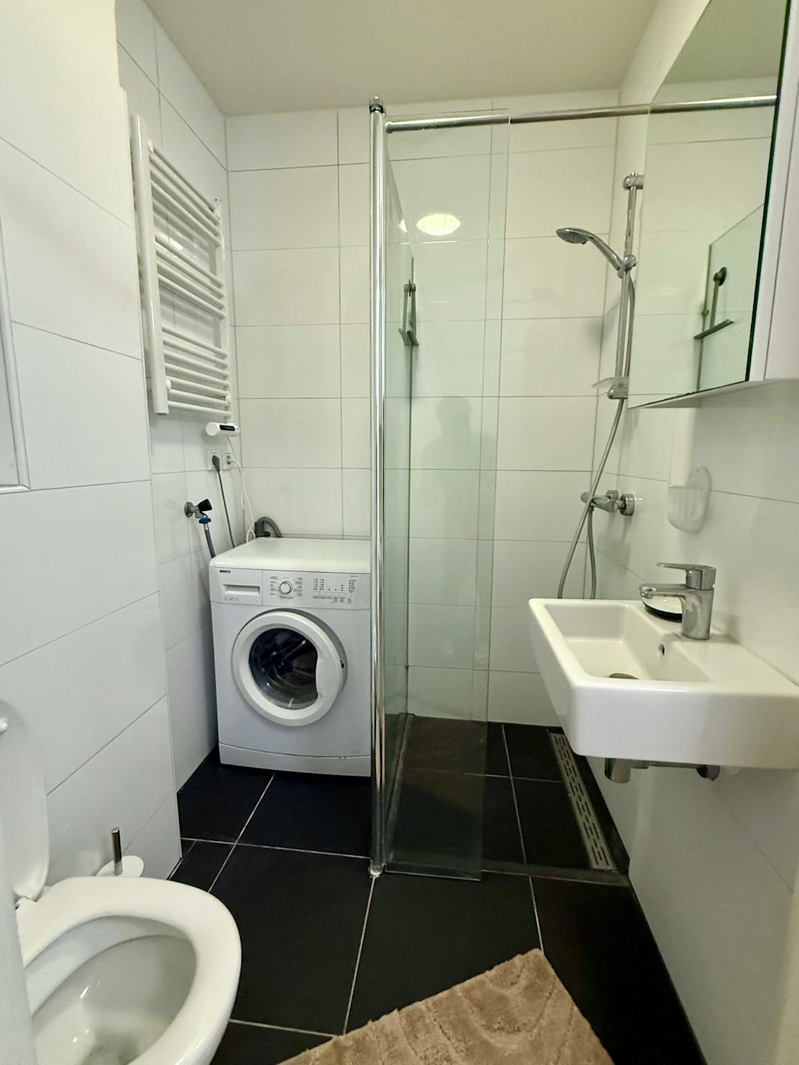 The semi-open kitchen provides access to the balcony through a sliding door. The bedroom is quietly situated at the rear of the apartment and also features sliding doors leading to the balcony. The bathroom is functionally designed and equipped with a walk-in shower, sink and toilet.