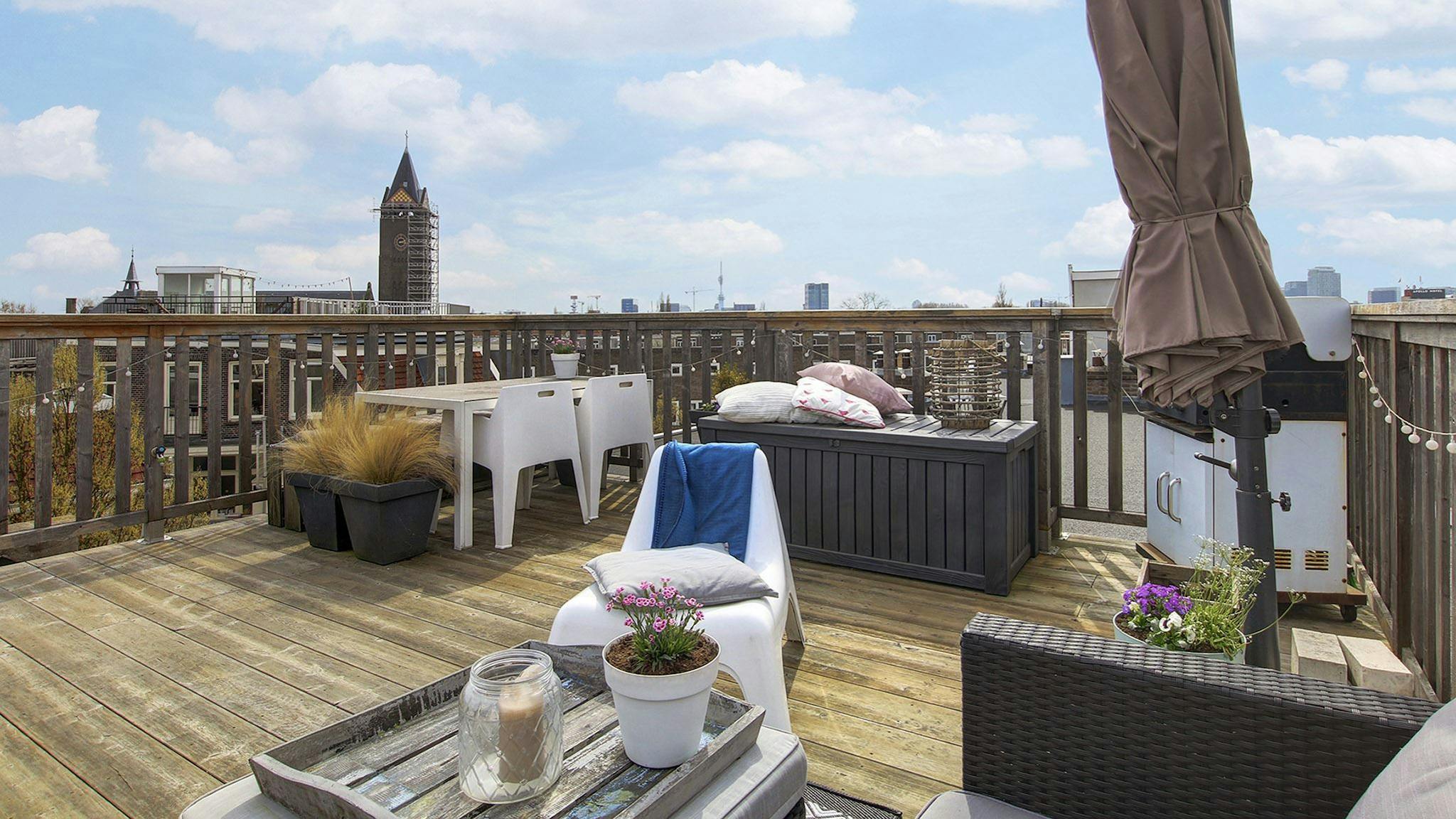The apartment is roughly 75m2 and comes with a large private rooftop terrace (additional 25m2). It has 2 bedrooms, a large bathroom, living room and kitchen, and is fully furnished.