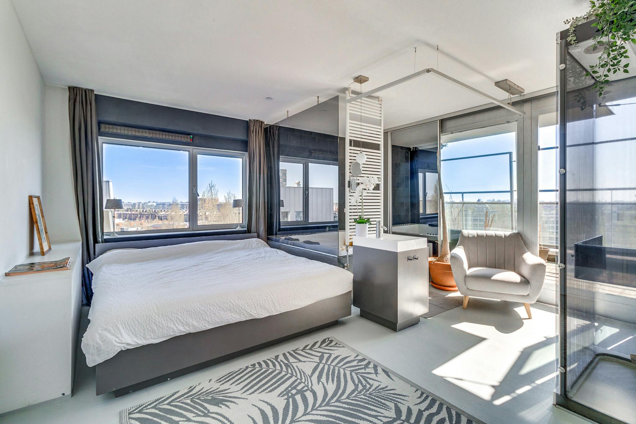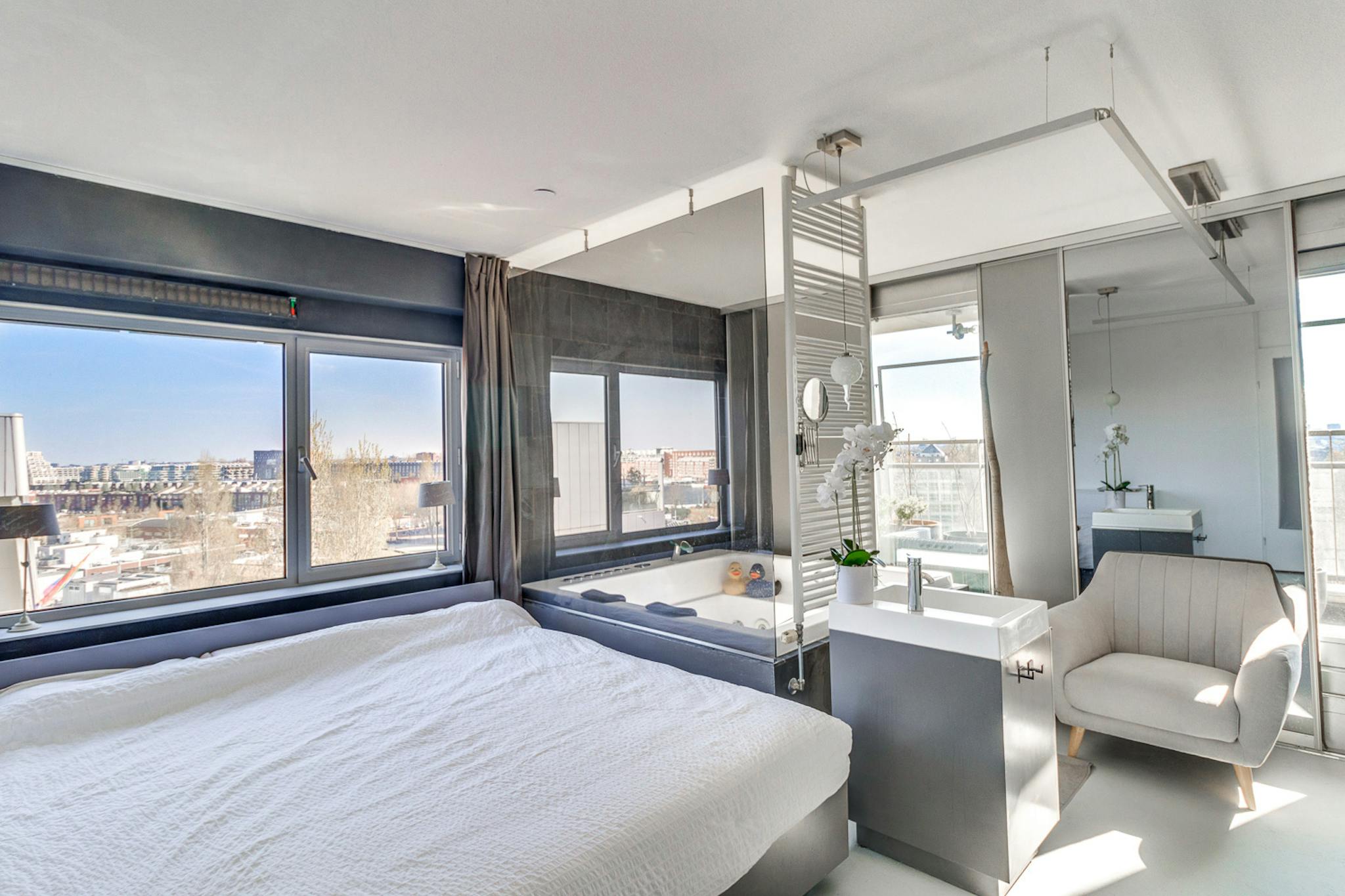 The heart of the home is a bright, open-plan living area that integrates seamlessly with kitchen, fully outfitted with all appliances. Every room in the apartment has been designed to frame a breathtaking view of (hidden), ensuring the space feels connected to the city while remaining a peaceful retreat. The master suite features a king-size bed and a generous bathroom equipped with a large Jacuzzi, a separate shower, and two sinks. A versatile second bedroom provides the flexibility needed for a home office or a comfortable guest room.