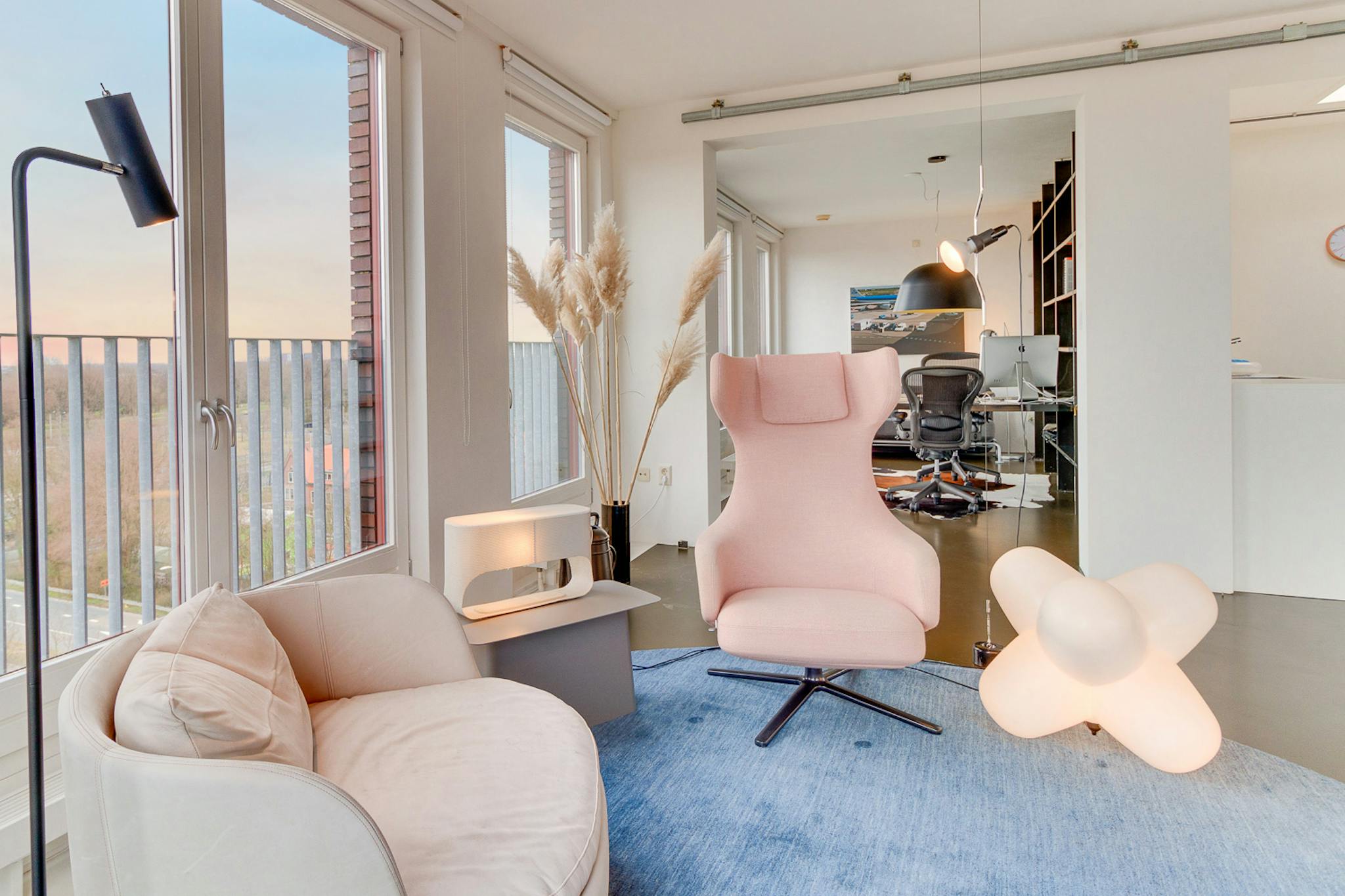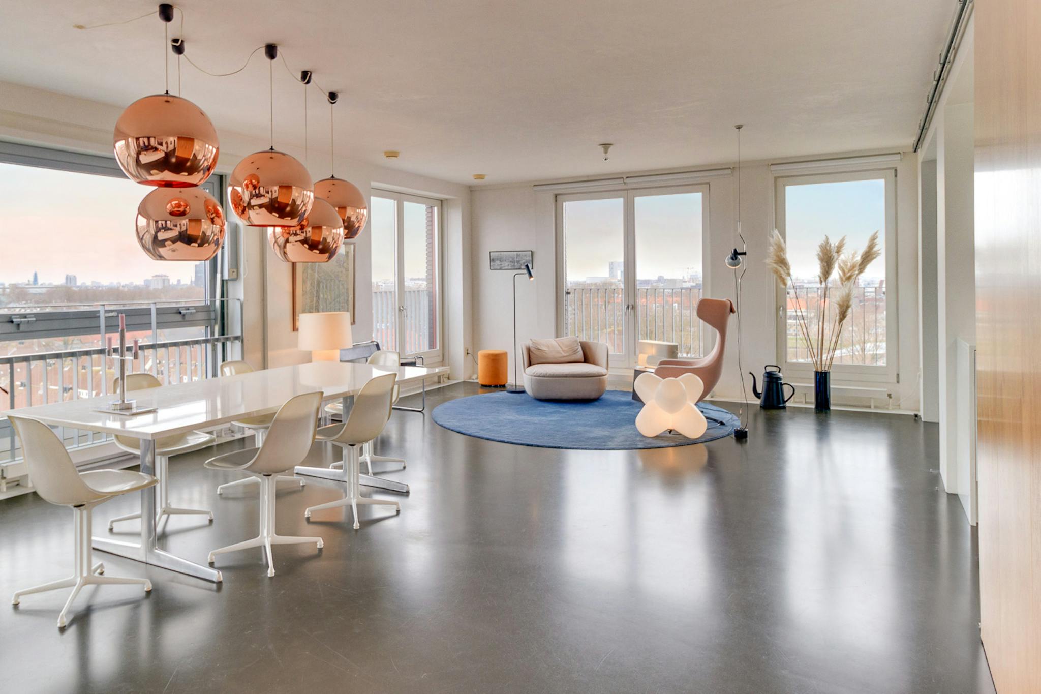 This very bright and generous 130 m2apartment features 1 master bedroom, walk-in closet room, plus office space / guest room. It is situated in a very central location in North, within walking distance of the North/South metro line, ferry to the City Center, and Noorderpark. The apartment is part of the “Albatros” complex, built in 2006. This remarkable apartment stands out for its spacious room dimensions, with the living room alone measuring approximately 60 m2, ample natural light, and fantastic views of the (hidden) skyline. In short, it is definitely worth a viewing!