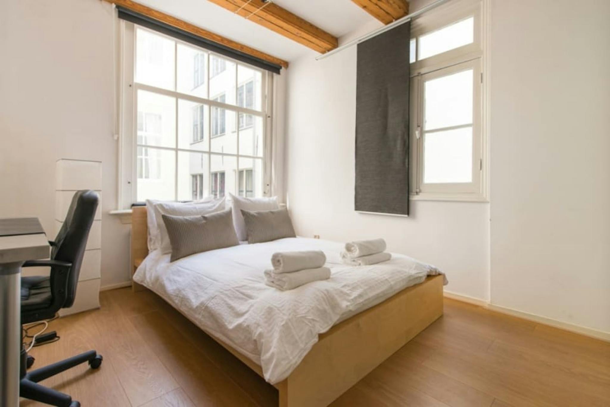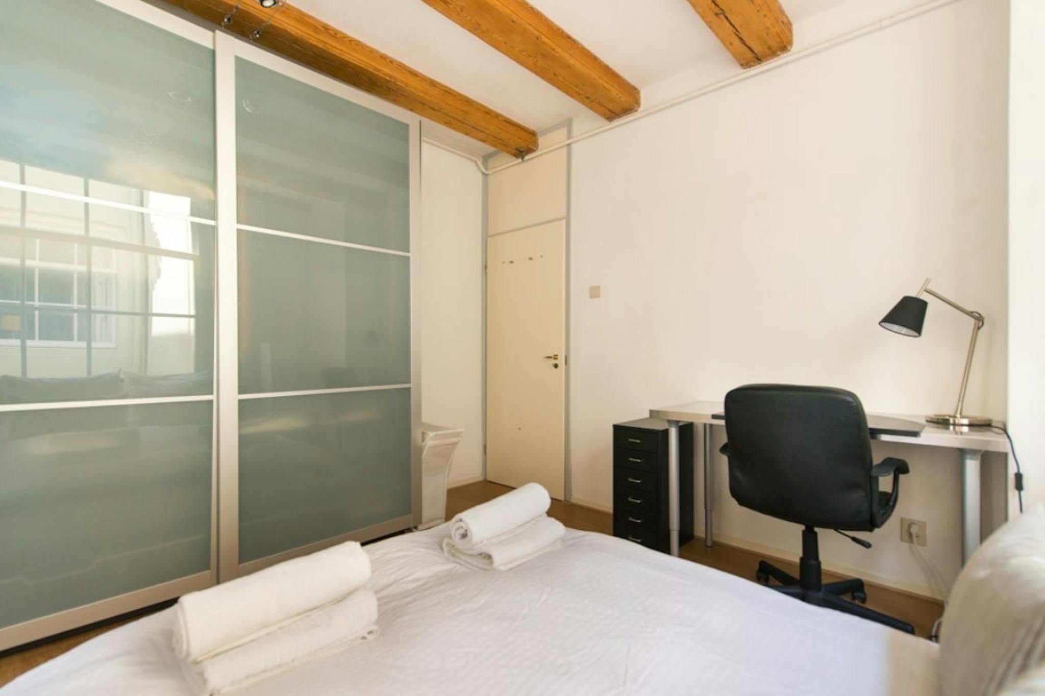 Welcome to this charming service apartment with a beautiful canal view, fully equipped for a comfortable monthly rental. The apartment features a cozy bedroom with soundproofed triple-glazed windows for a peaceful night's sleep. The room is furnished with a comfortable double bed, a desk for your work or study needs, and large wardrobes for convenient storage.