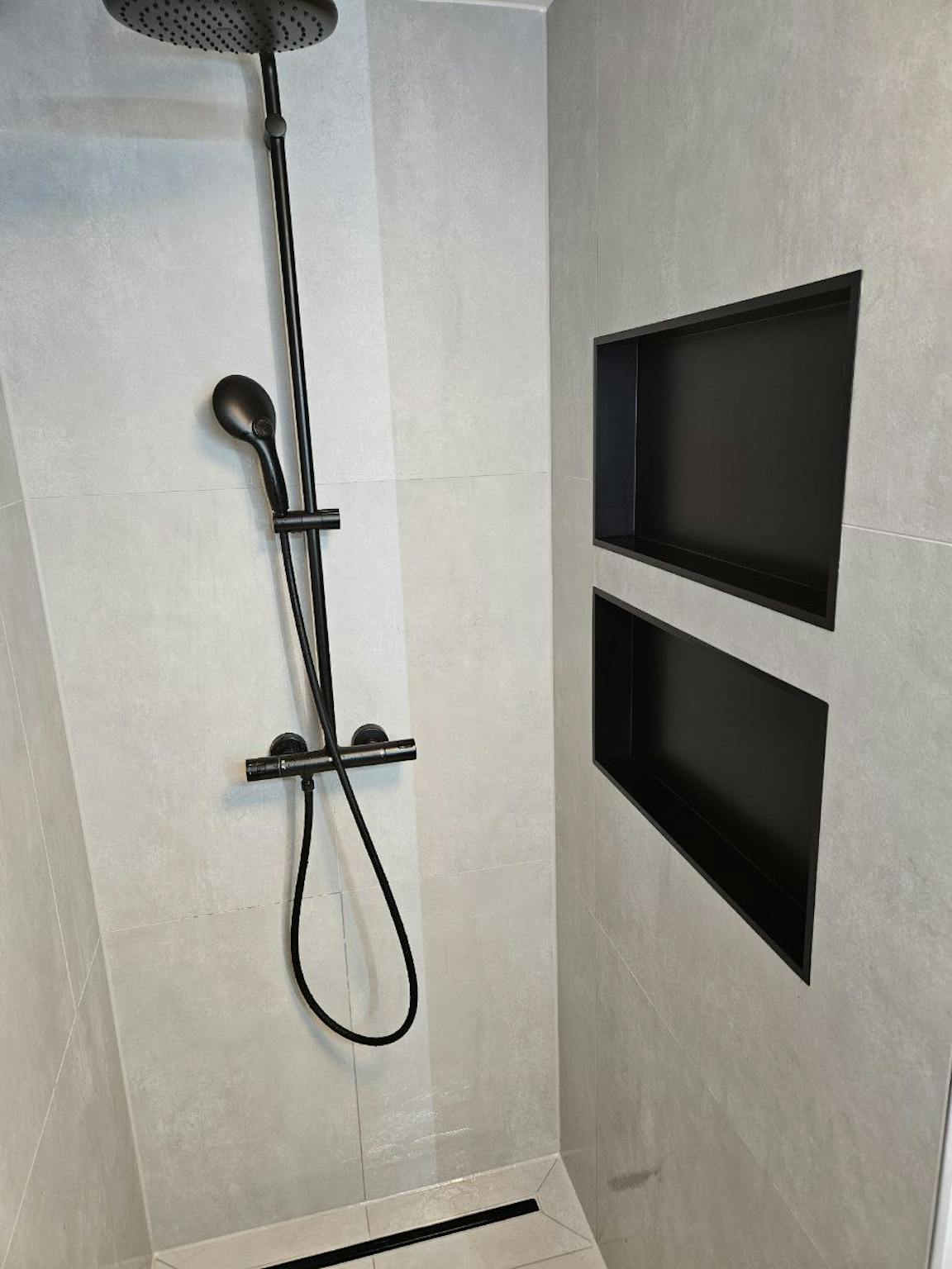 - Elegant bathroom: a luxury toilet with integrated bidet and a walk-in shower with deep mat black wall niches, and a large mirror cabinet with lights on the sides.