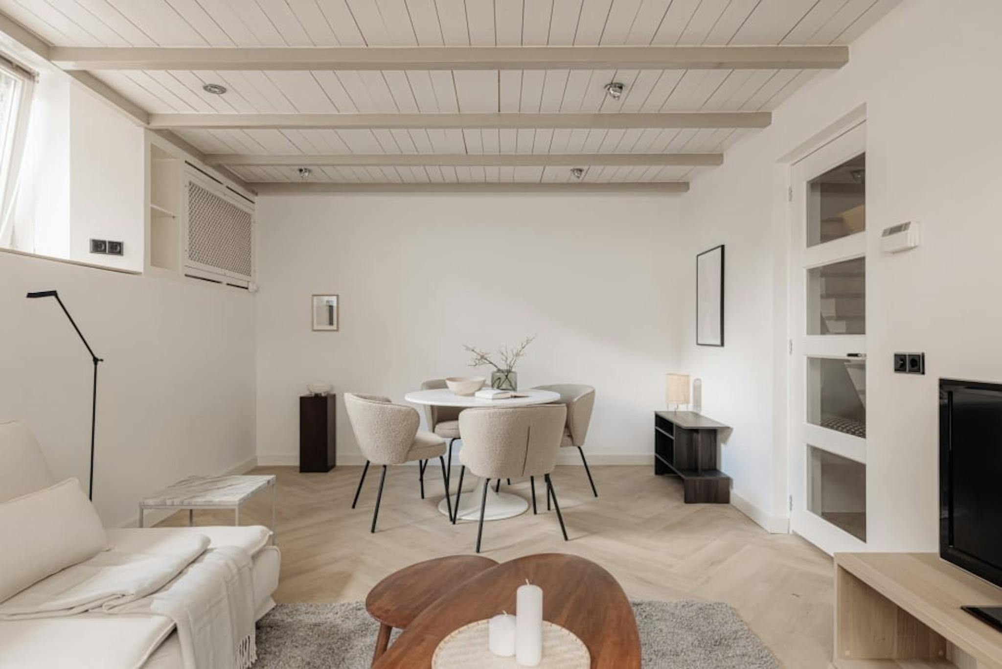 This cosy and conveniently located basement studio is perfect for an individual or couple seeking a comfortable, renovated space in the heart of Amsterdam. Recently renovated in 2024, the apartment features a spacious living and dining area, a well-equipped kitchen, a comfortable King-sized bed, and a large bathroom. The bathroom includes a shower, a large bathtub perfect for relaxation, a double sink, and a toilet. There’s also a storage room and a separate room with a washing machine and dryer. The living area is furnished with two comfy couches that can be converted into beds for additional guests.