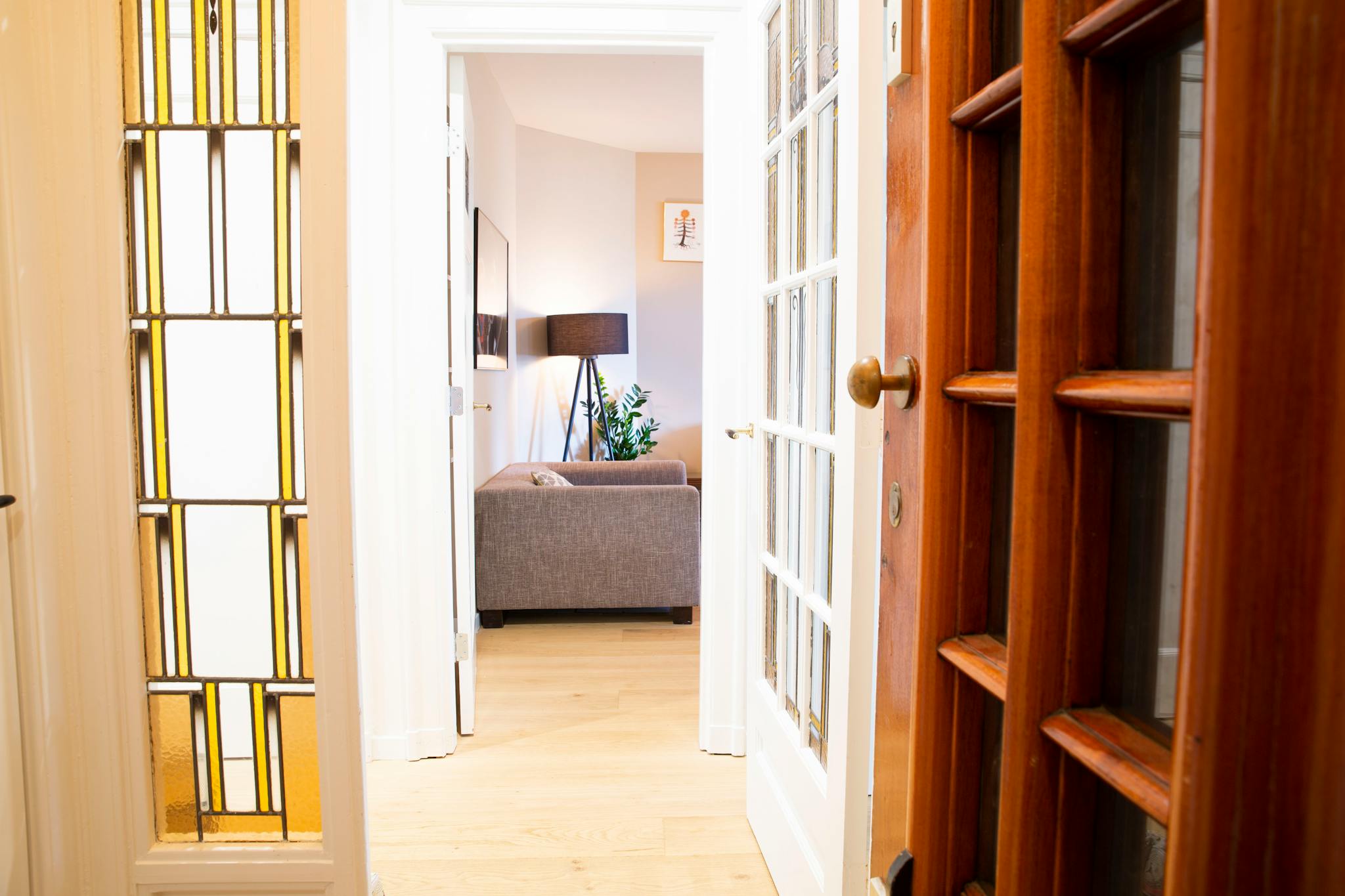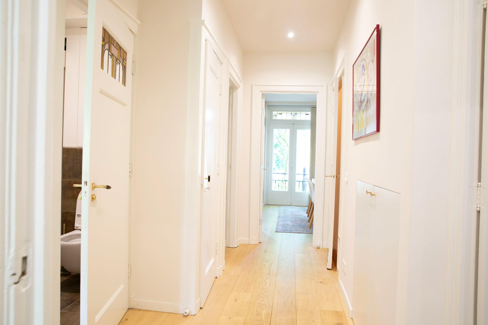 Non-SmokingNot allowedUnique, attractive and spacious modernised 1930s apartment (76 m2) with unobstructed views, two bedrooms and a balcony at both the (sunny) front and the rear! The apartment was completely renovated in 2021, whereby the many authentic 1930s details have been beautifully preserved. The high ceiling, 1930s stained glass and oak herringbone parquet floor complete th(hidden)ssic look! Whilst all fittings are modern and top of the range; underfloor heating, inbuilt speakers and wifi enabled lighting.