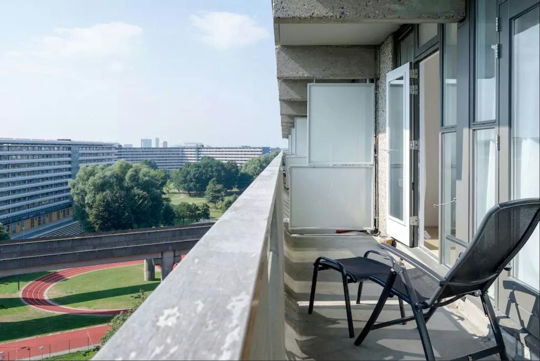 It features a living room with floor-to-ceiling windows, an open kitchen, and three bedrooms, plus a wide 8-meter balcony offering a beautiful view of southern Amsterdam.