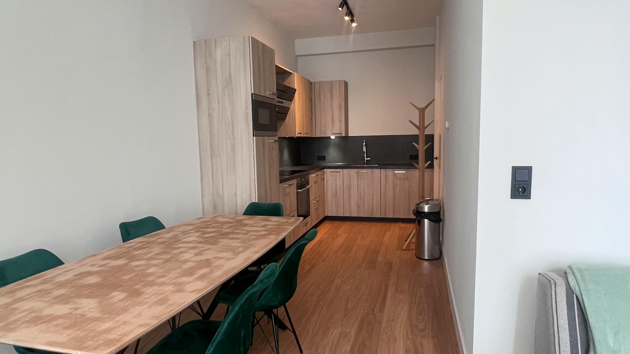 The fully furnished living room invites you to relax after a day in the city, while the modern kitchen is a true delight for cooking enthusiasts. It is equipped with a luxurious 5-burner induction cooktop, excellent ventilation, a built-in oven, and a boiling water tap—perfect for preparing instant tea or quick meals with ease.
