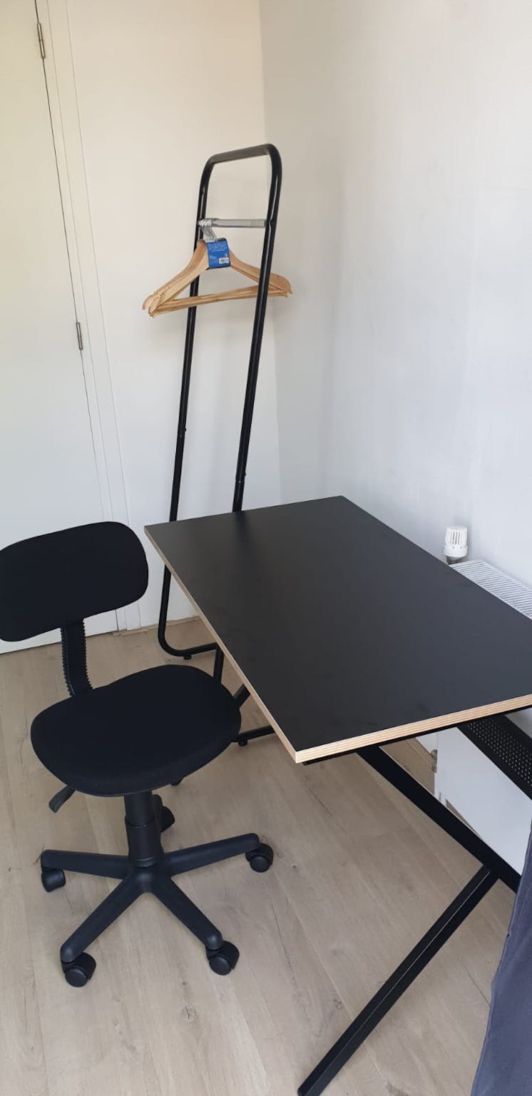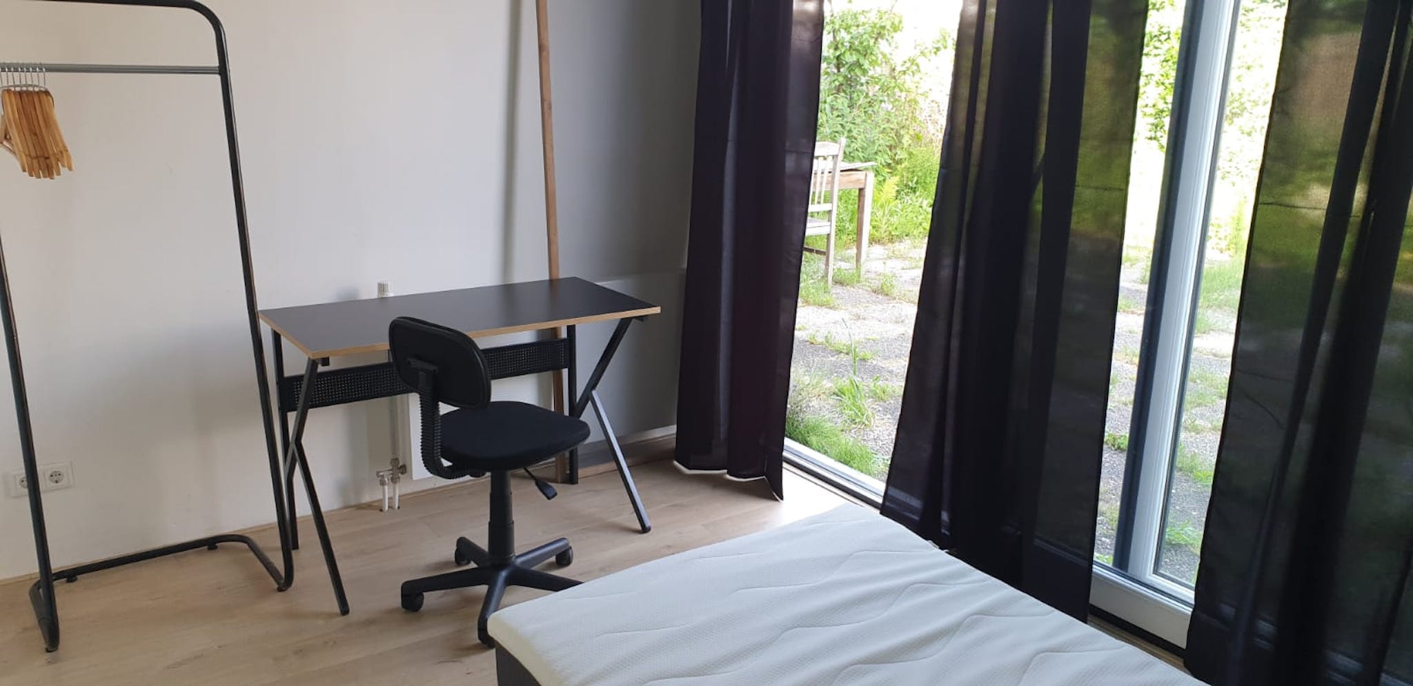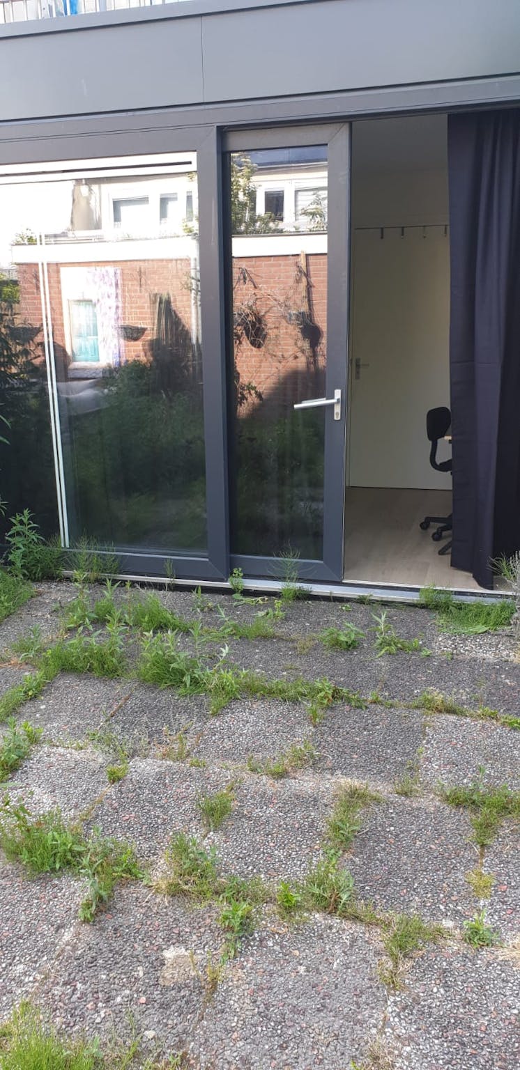 I hereby offer 1 fully furnished room: bed box combination Alta, 5 piece set: 2 boxes, 1 innerspring mattress, 1 headboard, 1 mattress topper 90x200 cm, office chair Tampa, side table black metal, desk Debbey (hidden) cm, painting Highlander black canvas 64x44x4, Wardrobe Liège - anthracite - (hidden) cm for rent in the coolest area of Amsterdam with a shared garden!