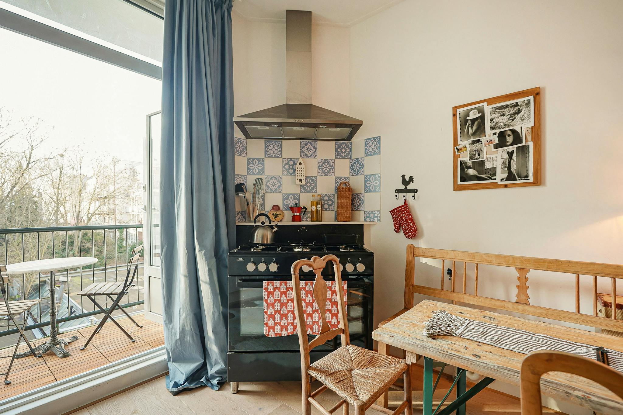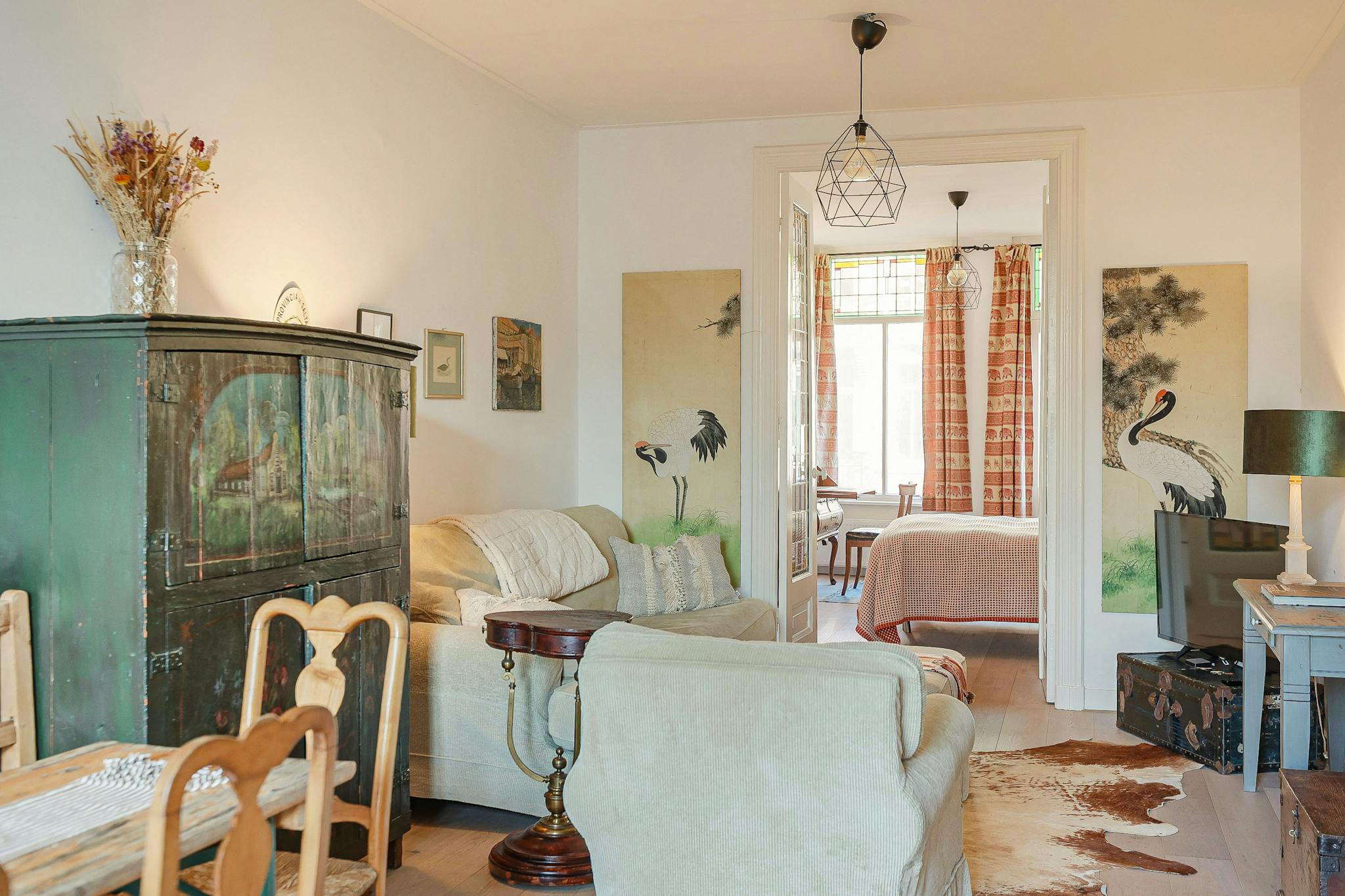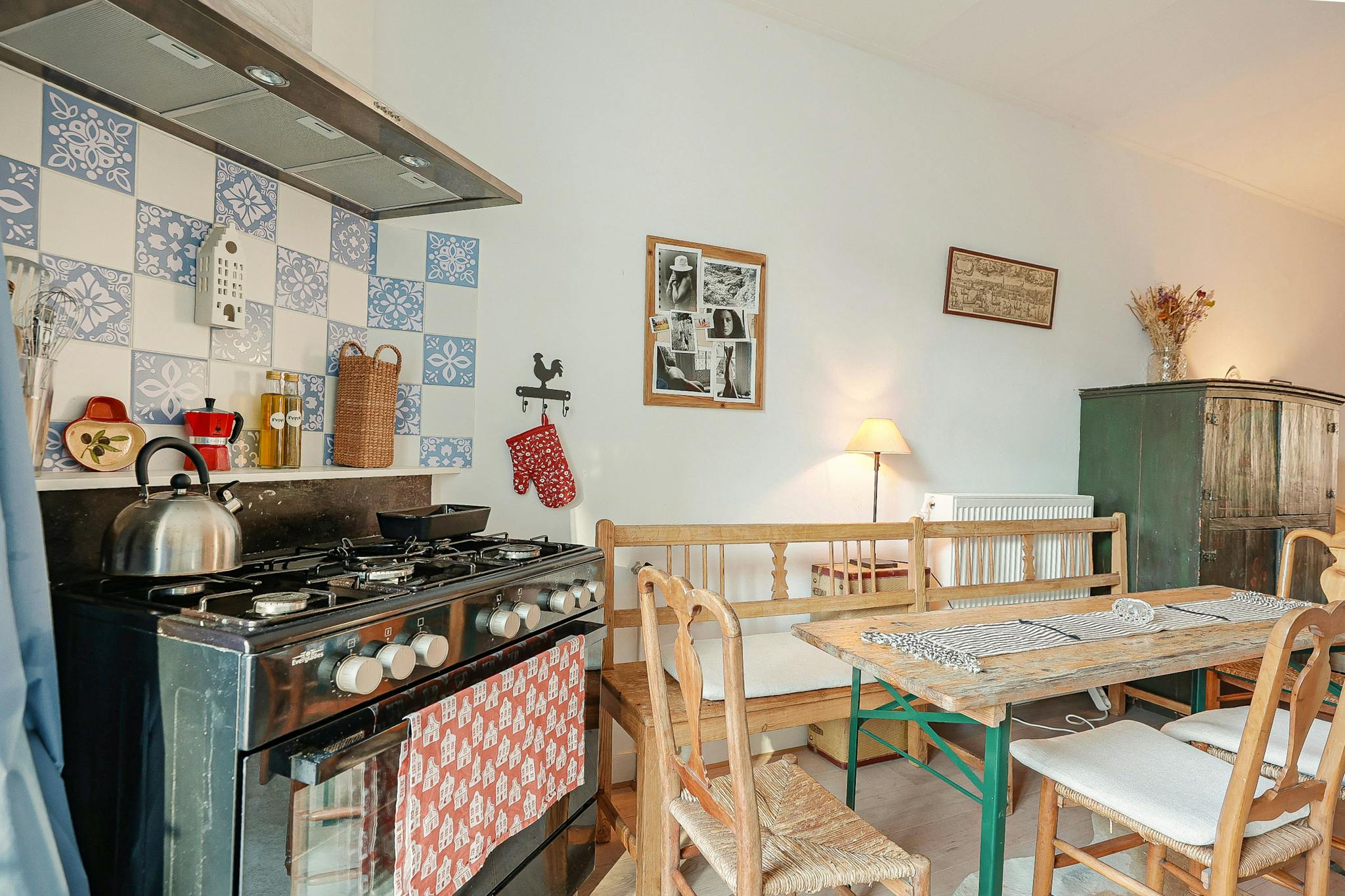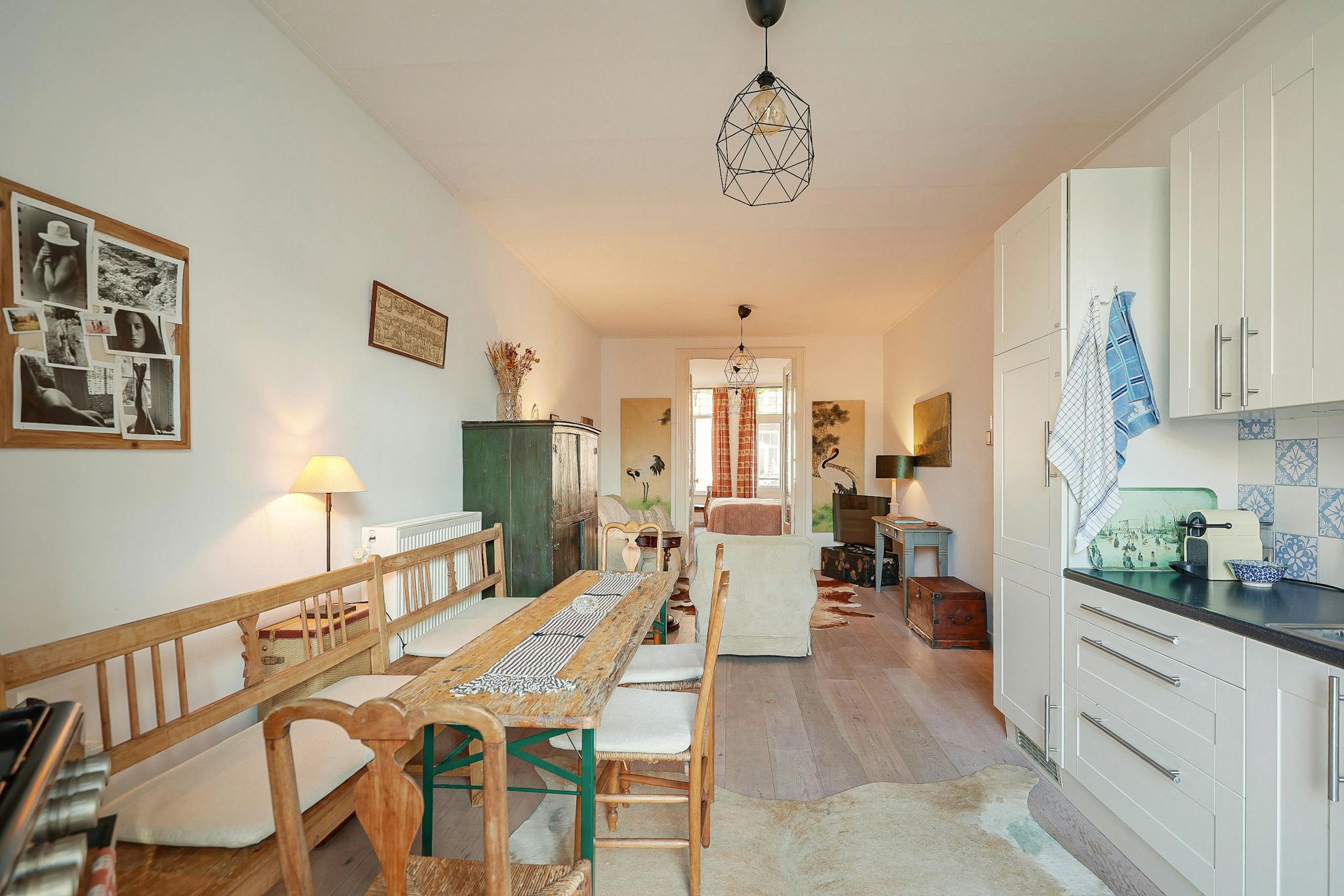 Open plan kitchen with a balcony on the west, on the east the living-room with a smaller balcony. A small bathroom, a modest bedroom in the back and the guest room in the front of the house. As you might have suspected, I like antique. All the furniture I bought at the Amsterdam auction (Veilinghuis De Zwaan)