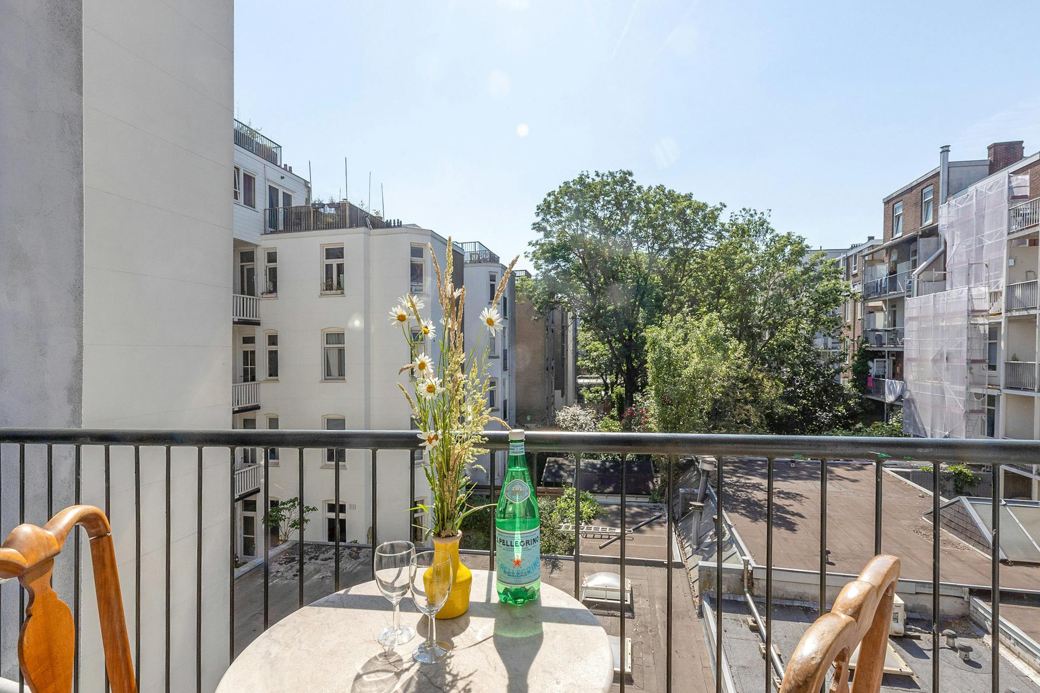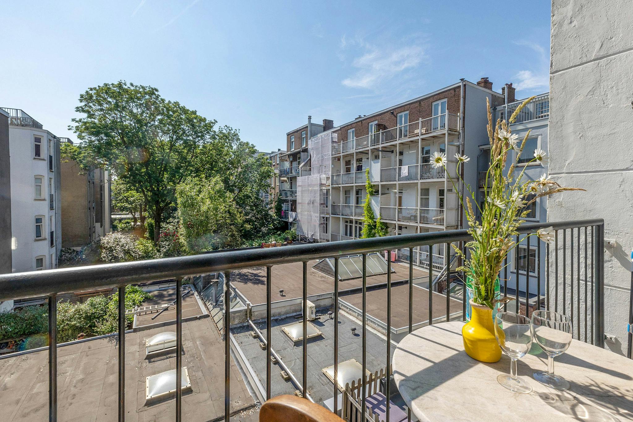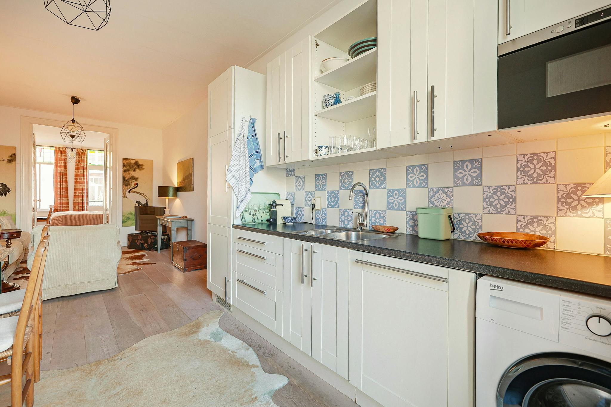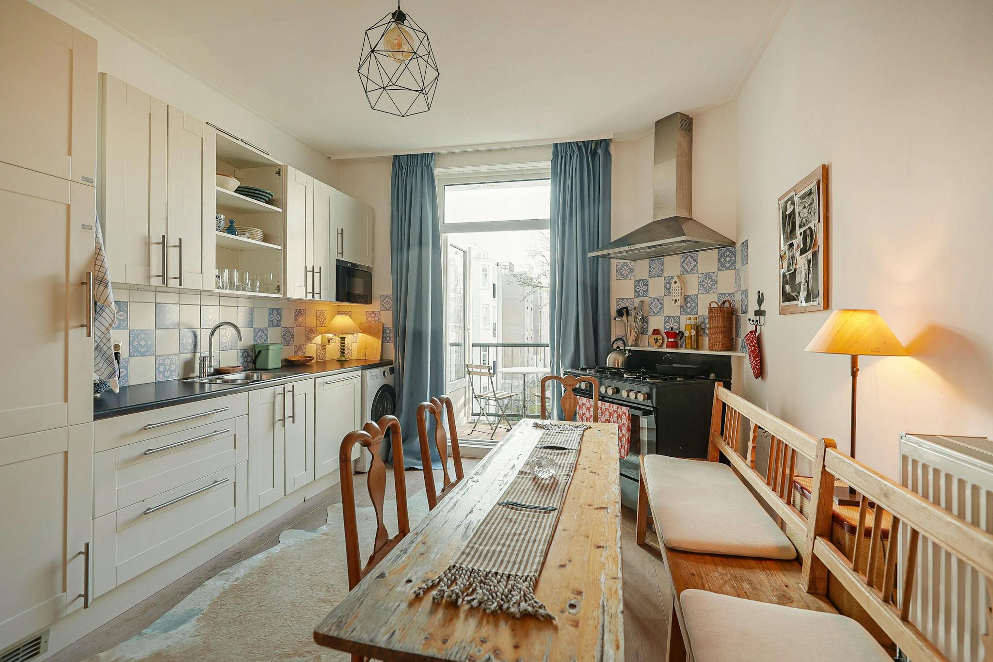 Open plan kitchen with a balcony on the west, on the east the living-room with a smaller balcony. A small bathroom, a modest bedroom in the back and the guest room in the front of the house. As you might have suspected, I like antique. All the furniture I bought at the Amsterdam auction (Veilinghuis De Zwaan)