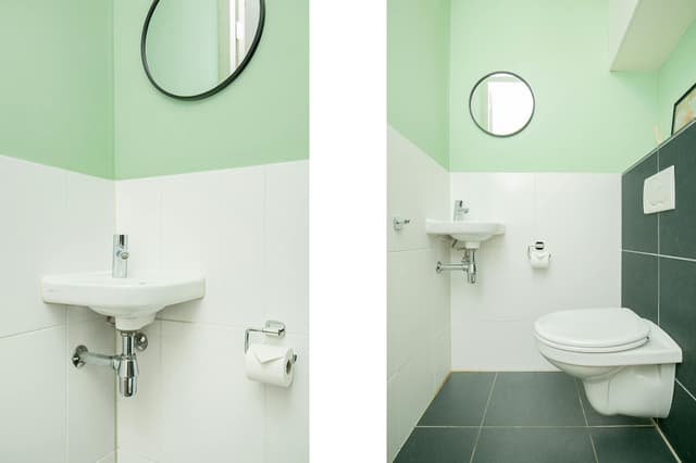 The bathroom is also positioned at the front, with a bathtub overlooking the treetops. It further features a separate walk-in shower, a second WC, and a washbasin.