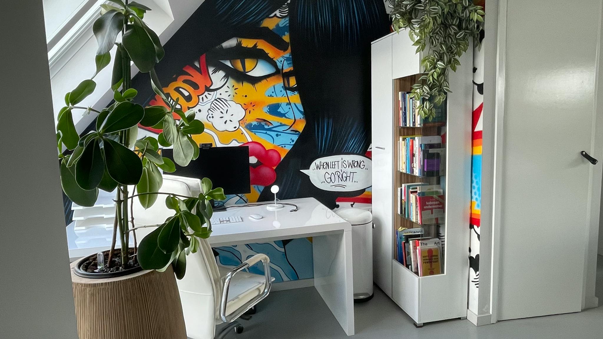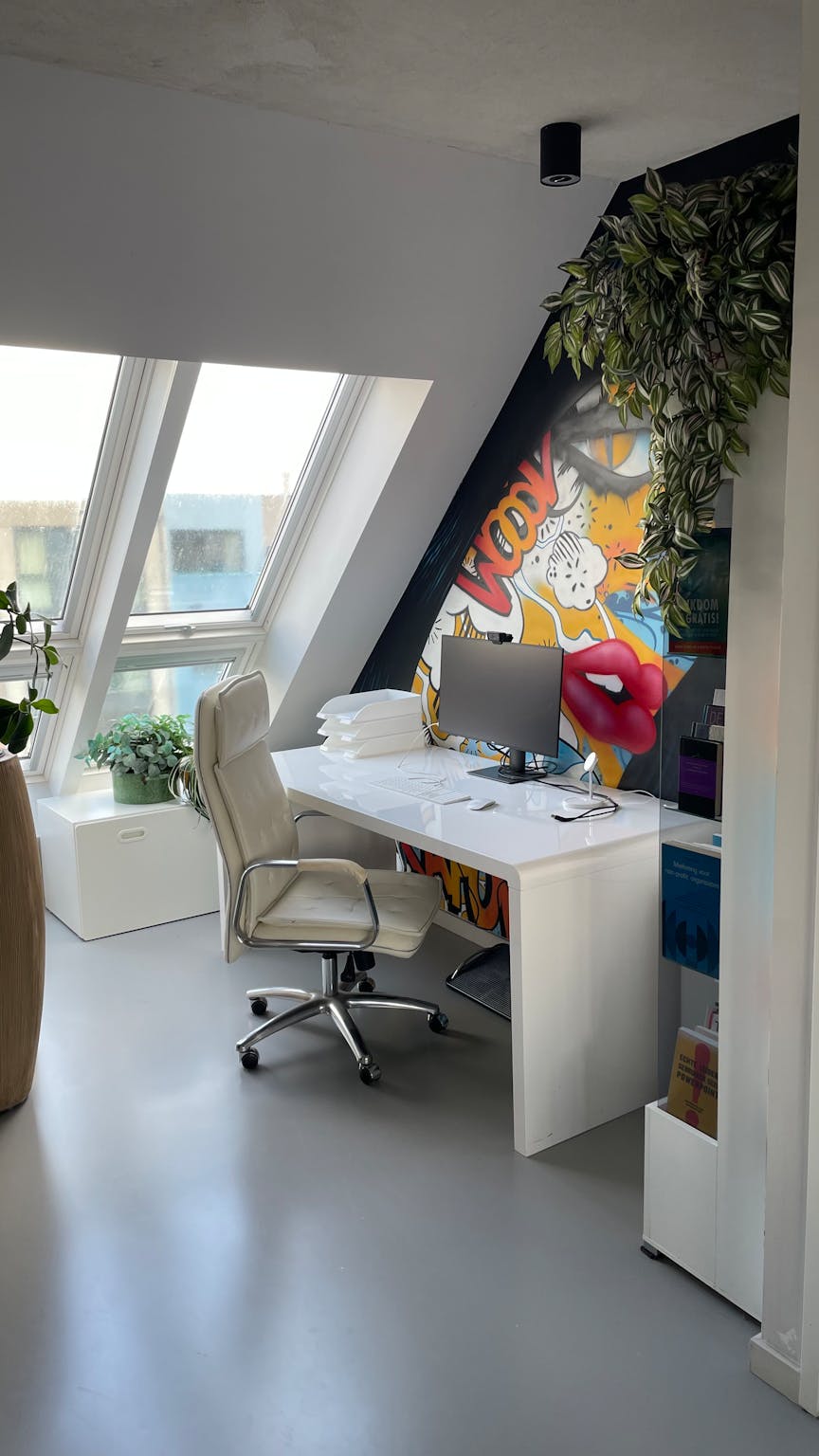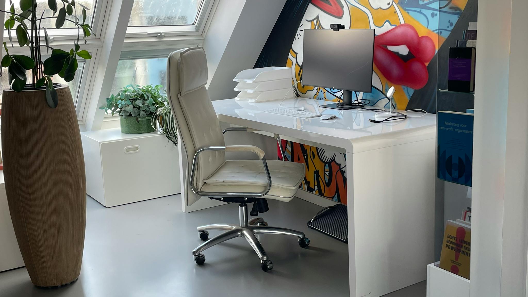 The workspace has a spacious desk, comfy desk chair and big Dell screen -with Apple mouse and keyboard- to connect with your laptop. For online meetings, you could use the separate Logic webcam.