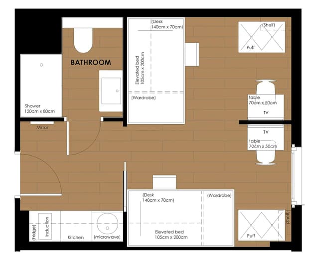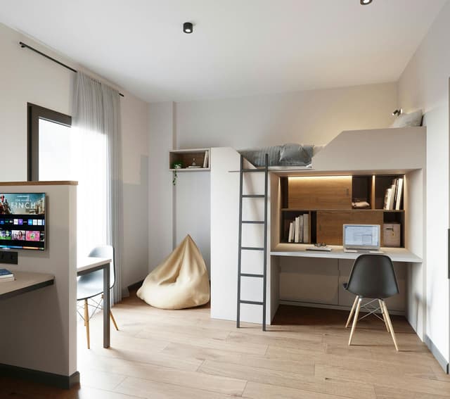 Elevated single bed (105cm x 200cm) above desk (140cm x 60cm) within a premium studio (25.5m2). The studio is shared with one other student and features a kitchen and ensuite bathroom. Each student is also provided with a 32” smart TV, table (70cm x 50cm), 2 chairs, and a seating puff. Located in the quieter postgraduate building with full access to all residence amenities.
