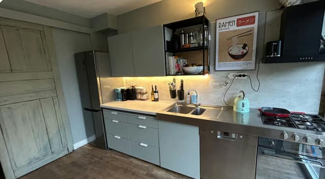 Generous living room (8 meters deep, 4 meters wide) featuring a cozy wood stove complemented by central heating with a new boiler for your comfort.