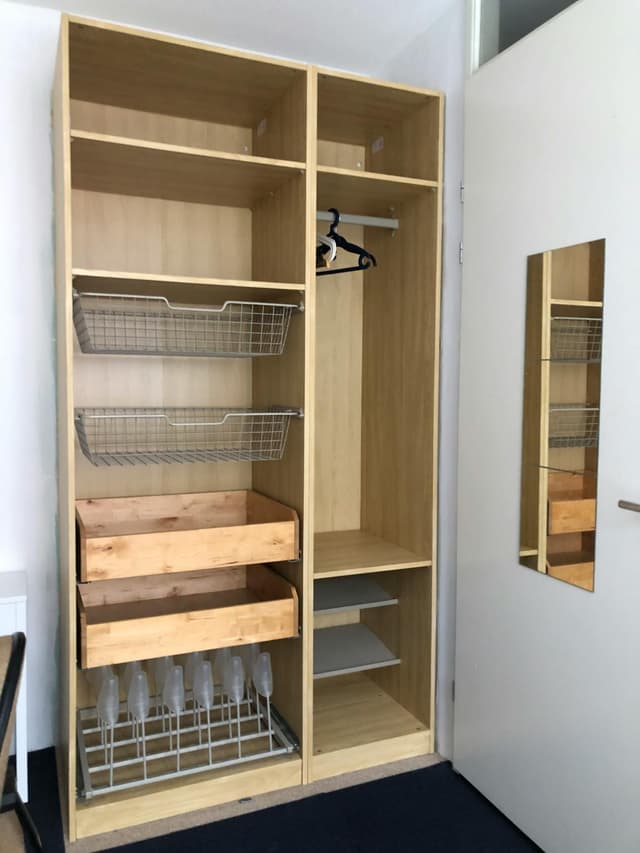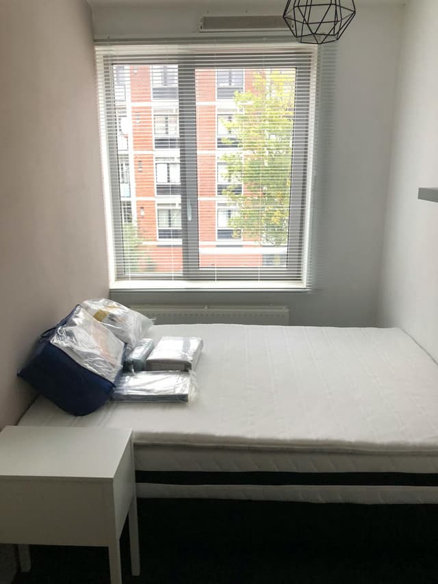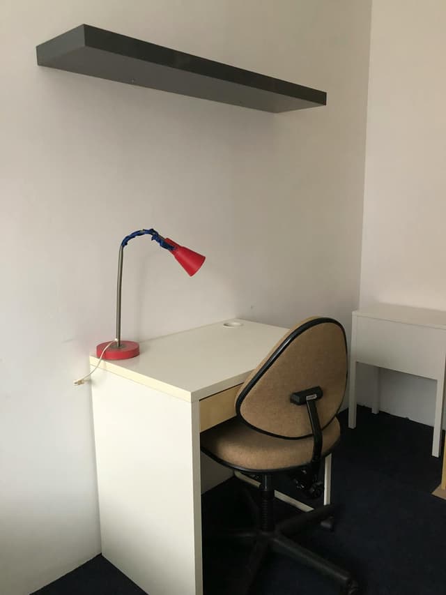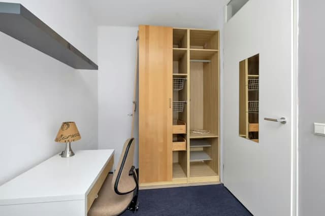 The bedroom is equipped with a double bed, spacious wardrobe, desk, and bedding included.