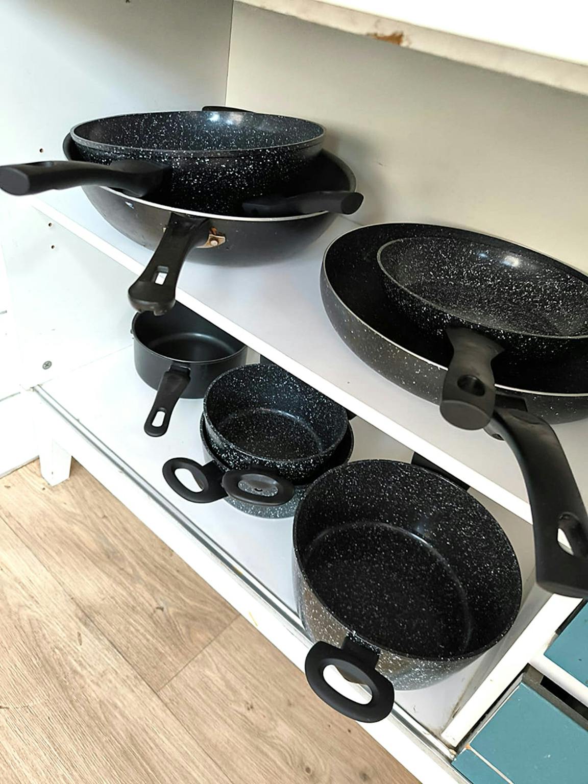 The kitchen has a gas stove, big fridge, pans and plates, forks, knives, microwave, etc... everything for cooking and storing your food.