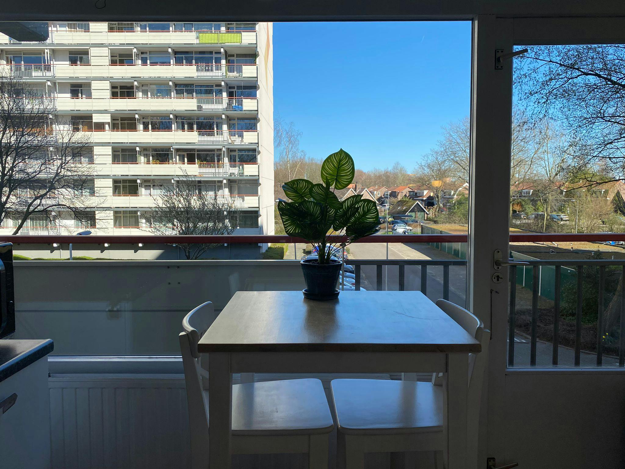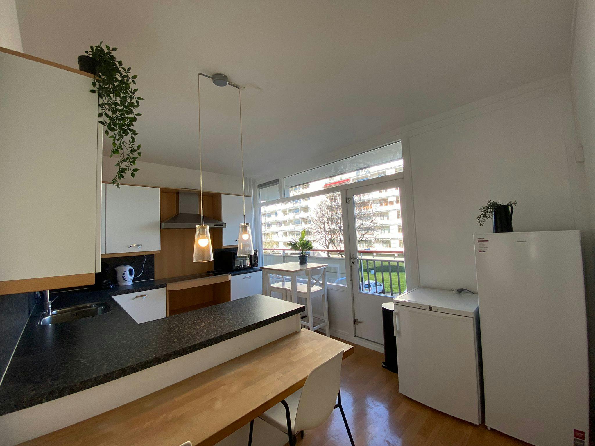 Via the kitchen you have also access to a shared balcony to get some fresh air and enjoy the weather. If you have a bicycle you can put it safely away in a small shed on the ground floor. You can park your car on the buildings parking place.