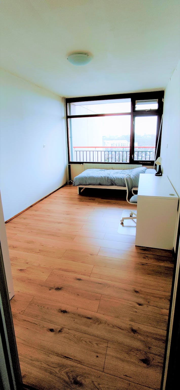 All bedrooms have a bed, a desk, a book shelf and a clothing cabinet. The kitchen has all major appliances: fridge/freezer, microwave/oven and washing machine. The house is very light due to the big windows on all sides of the apartment. The view from the eleventh floor is stunning! The rent price includes all advance payments for utilities and fees.