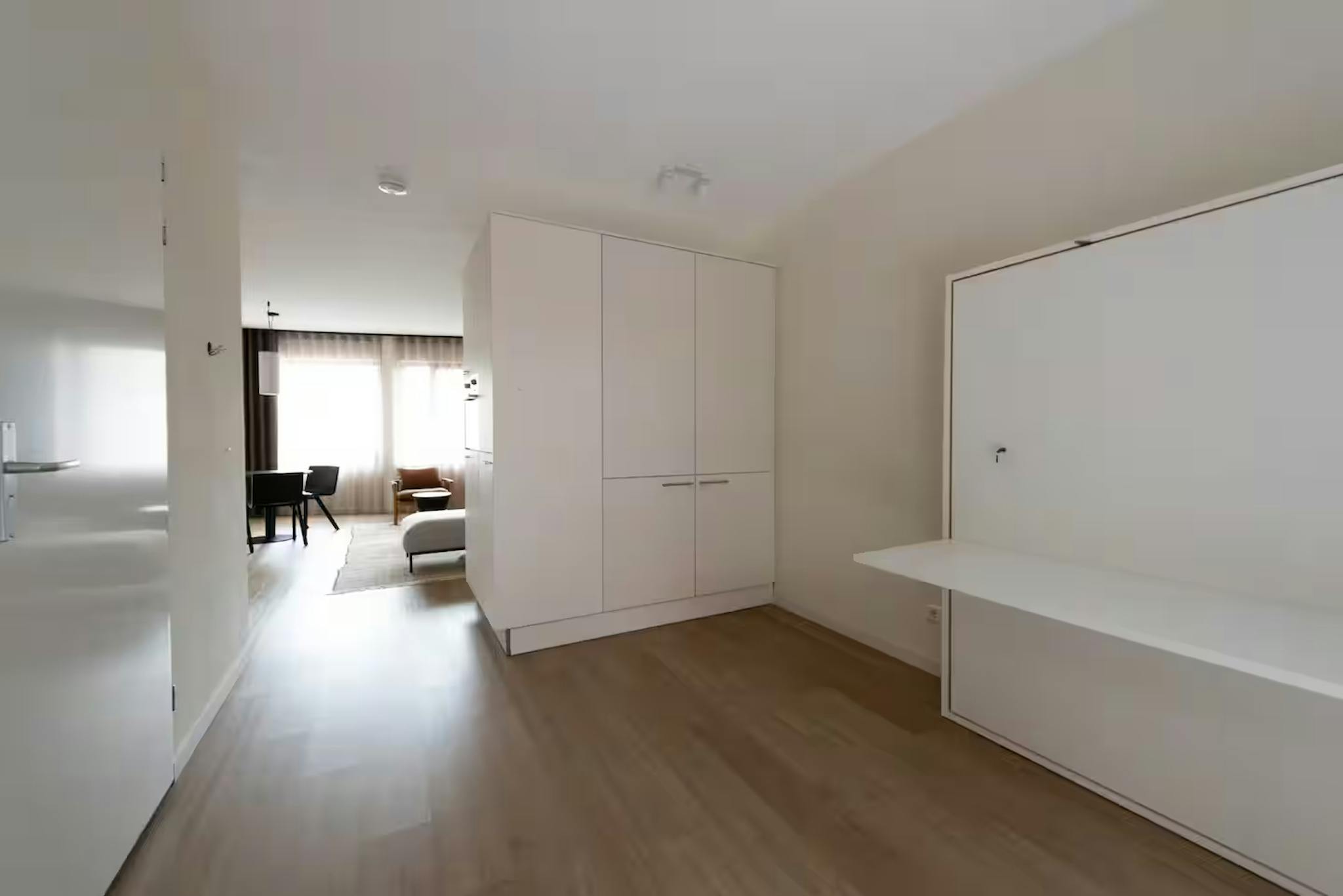 The design of this property has a very modern approach, giving it a very chic appearance. The Scandinavian interior ensures plenty of brightness and light in the studio. The space is cleverly divided by using a desk bed. This piece of furniture functions when unfolded as a bed (160x200) and folded as a desk to save space.