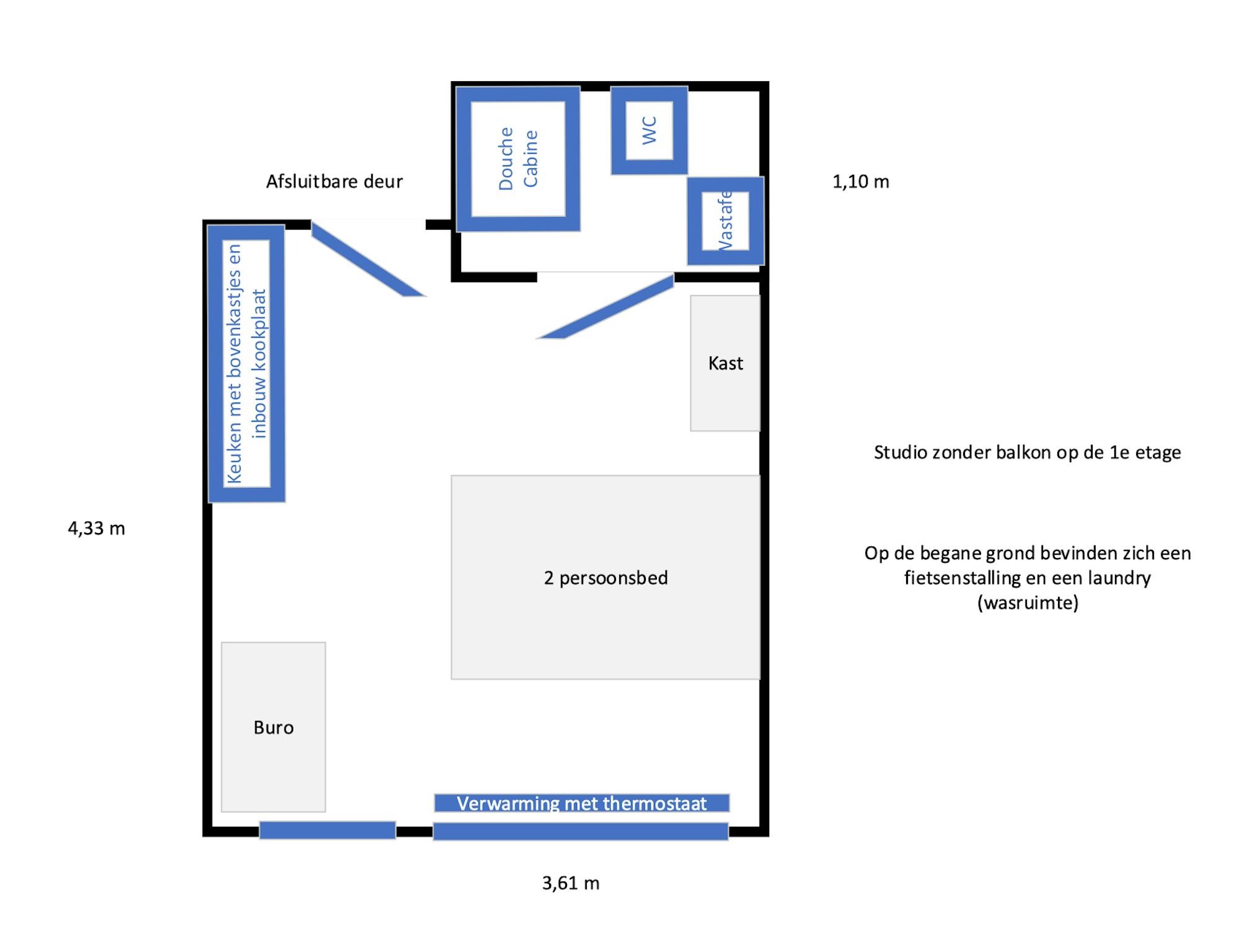 Non-SmokingNot allowedRecently renovated studio available on Delft University campus (Julianalaan) with kitchen, toilet and shower. Fully furnished (double bed, cupboard, desk, chair, blinds). Utilities and Internet included (800 mbps). Hue lights. A shared washing machine and dryer are available at no extra cost. The studio is about 17,5m2.