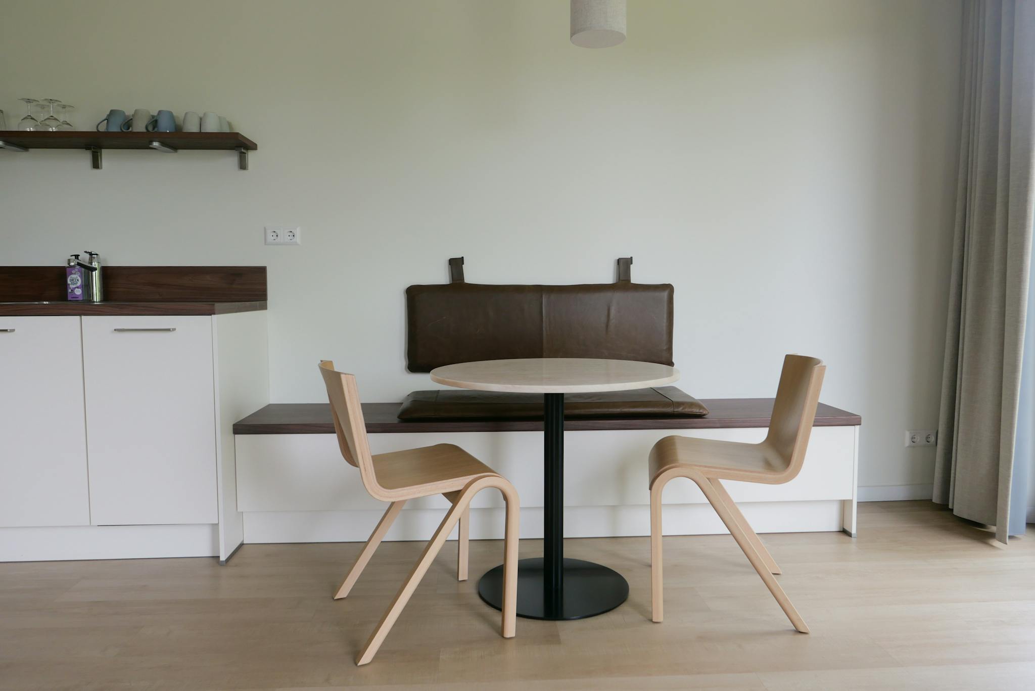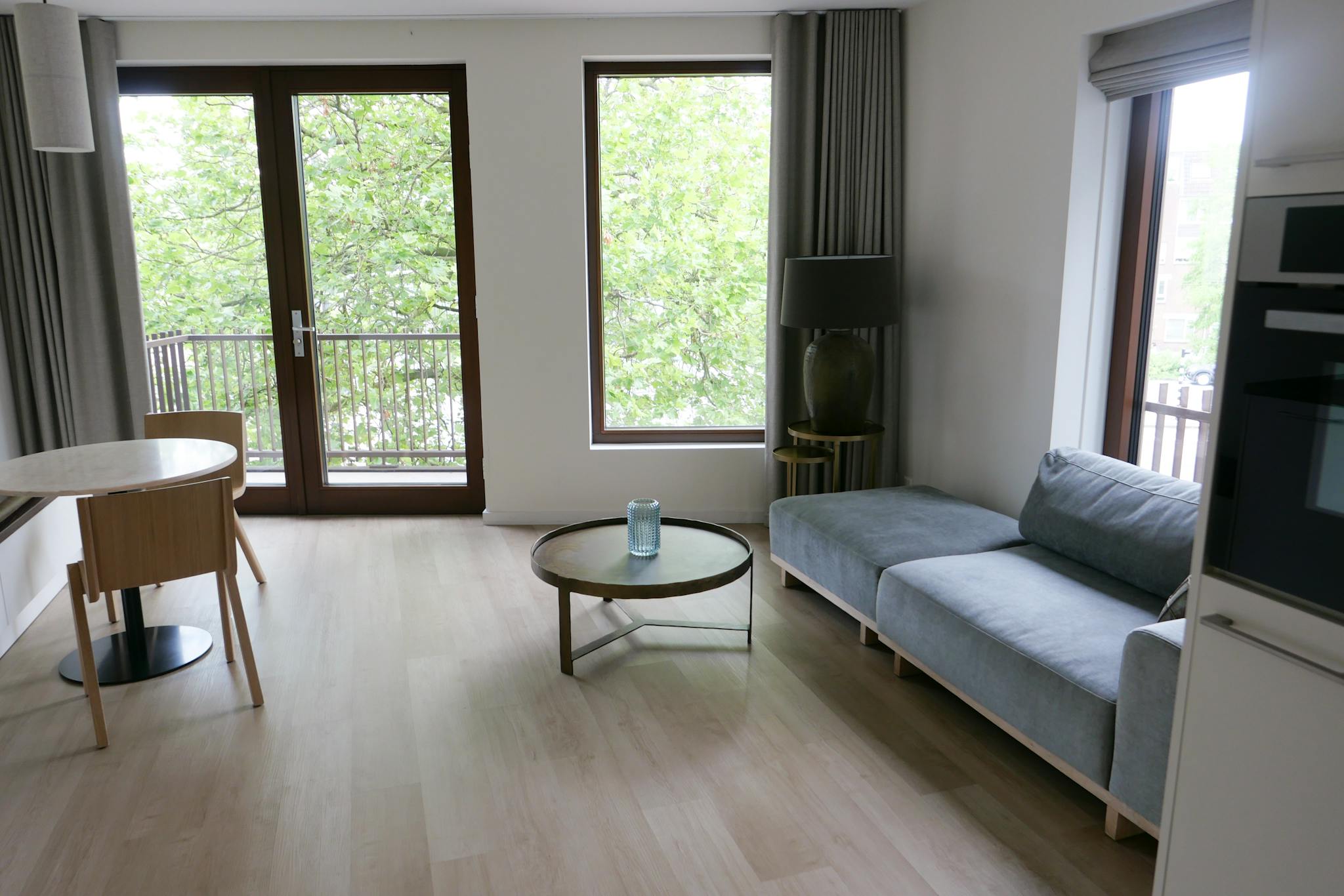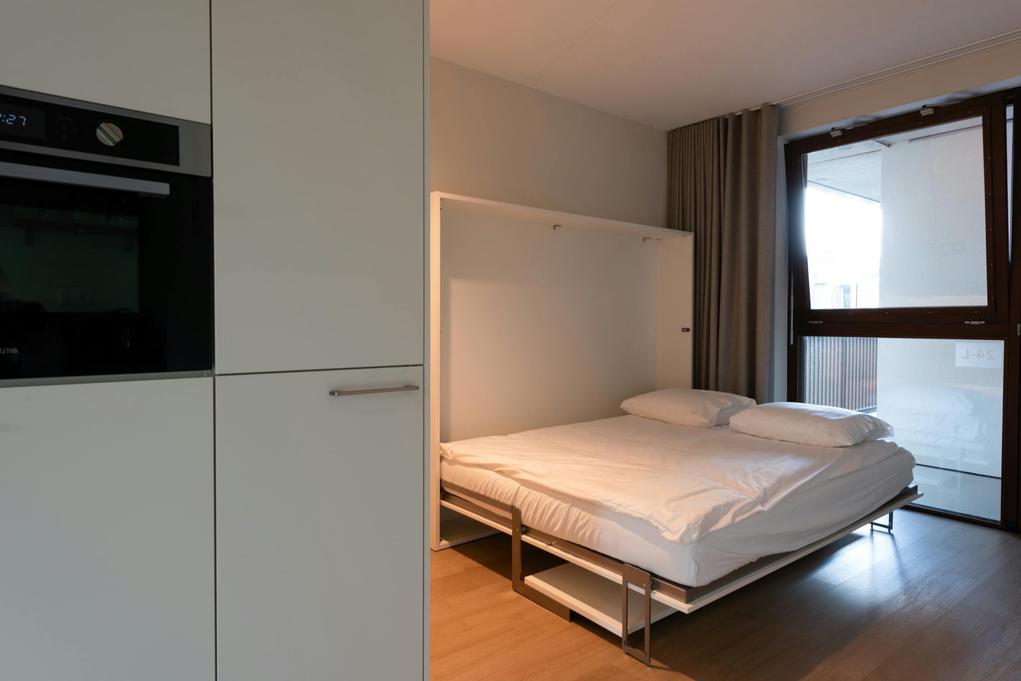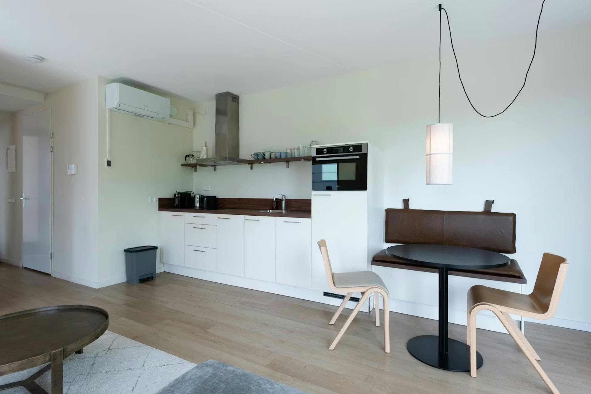The corner homes are all located on a corner. This creates a playful space with lots of light. They have a nice living area with a sofa including a footstool and this living area is separated by a built-in wardrobe from the sleeping area. All corner apartments also have a balcony facing the front of the building.