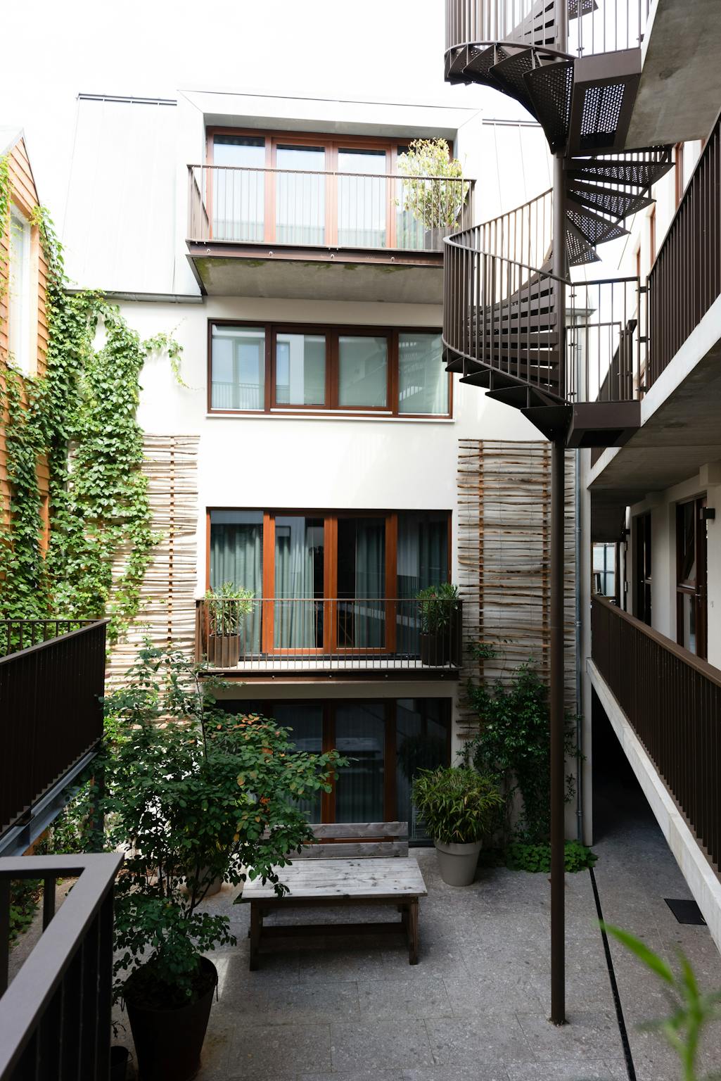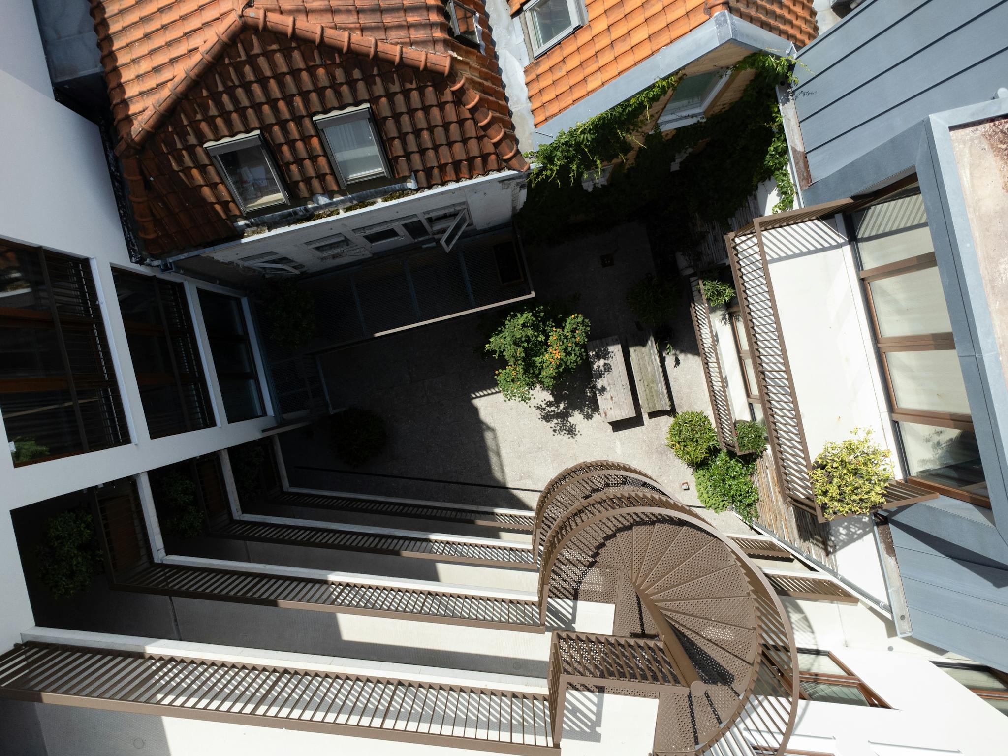 When you enter, there is a large built-in wardrobe on your right where you can store all your personal items. There is also a bathroom with a walk-in shower and a separate toilet. Furthermore, the first floor is spacious and offers plenty of space to work at the desk and sleep. When you take the spiral staircase up, you enter a bright, beautiful space with an L- shaped kitchen equipped with everything you need. There is also a large comfortable sofa and you can open the patio doors or relax on your south-facing balcony overlooking the courtyard.