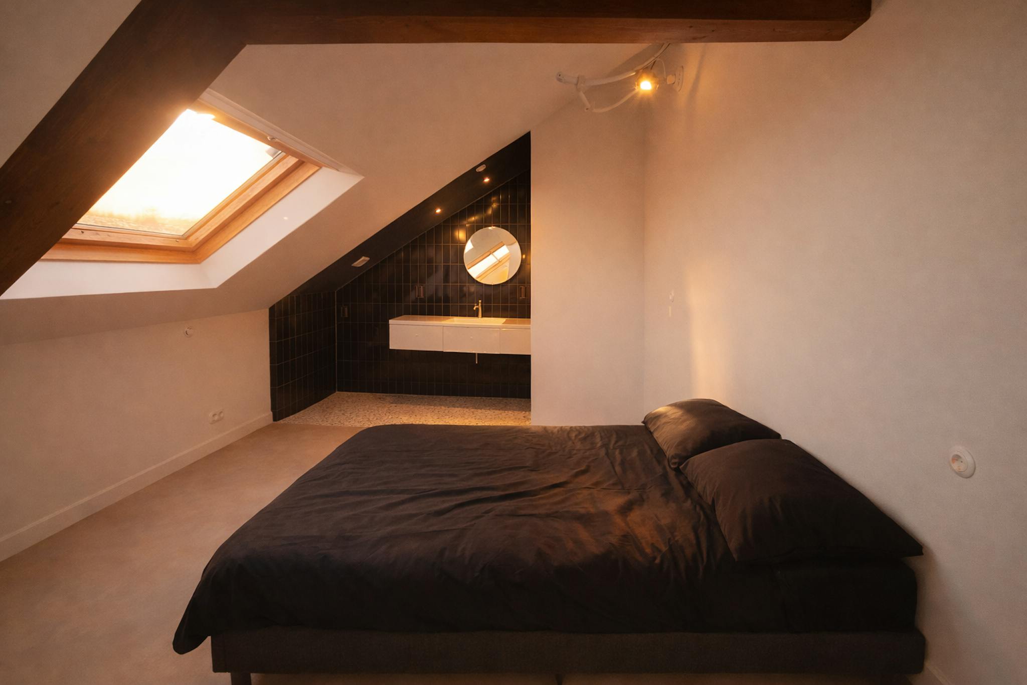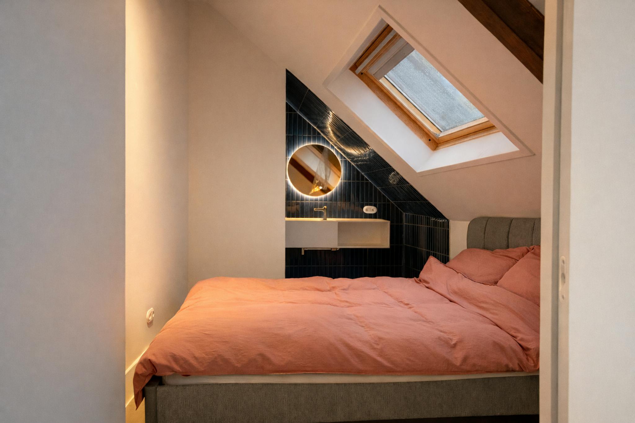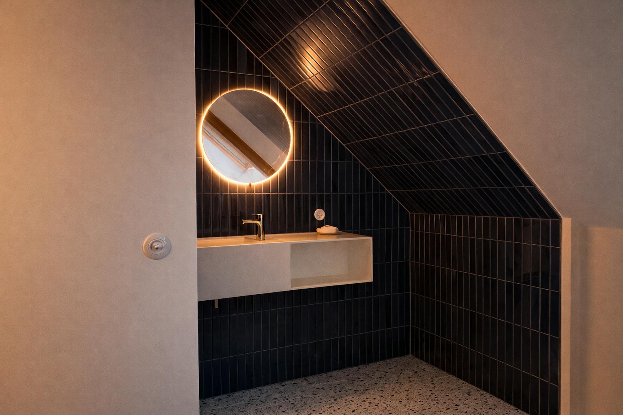 The modern bathroom is finished to a high standard and includes a vanity unit and a walk-in shower. A separate toilet is available.