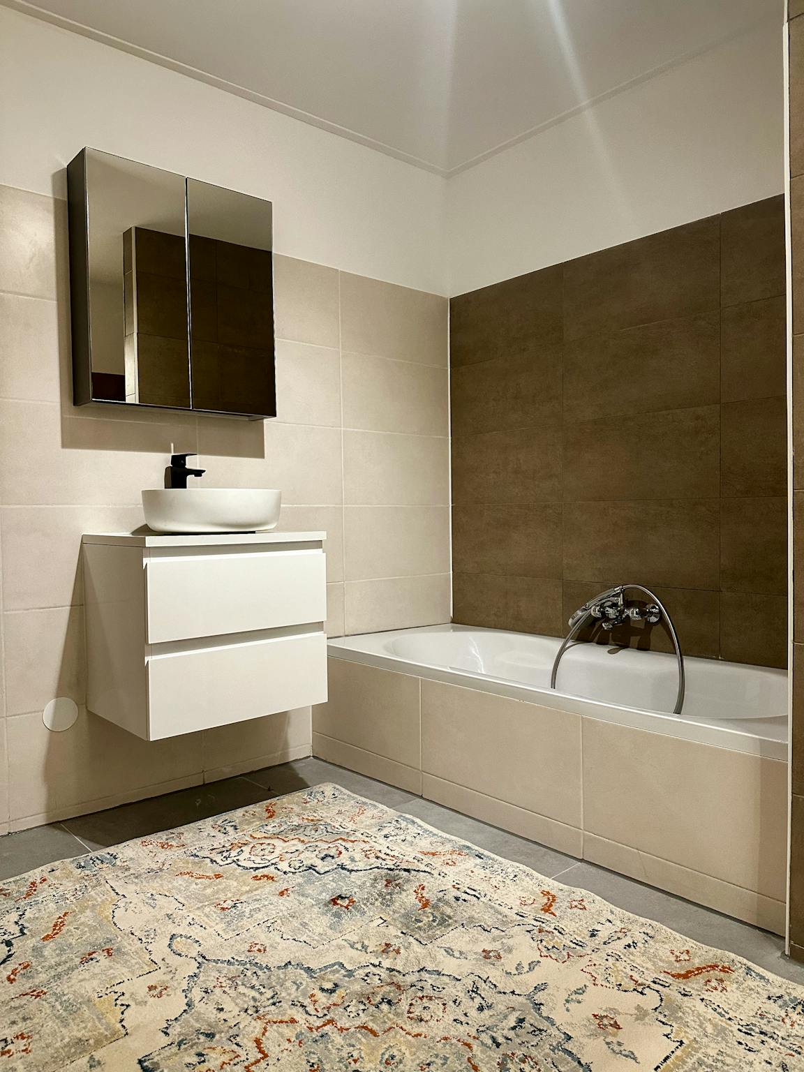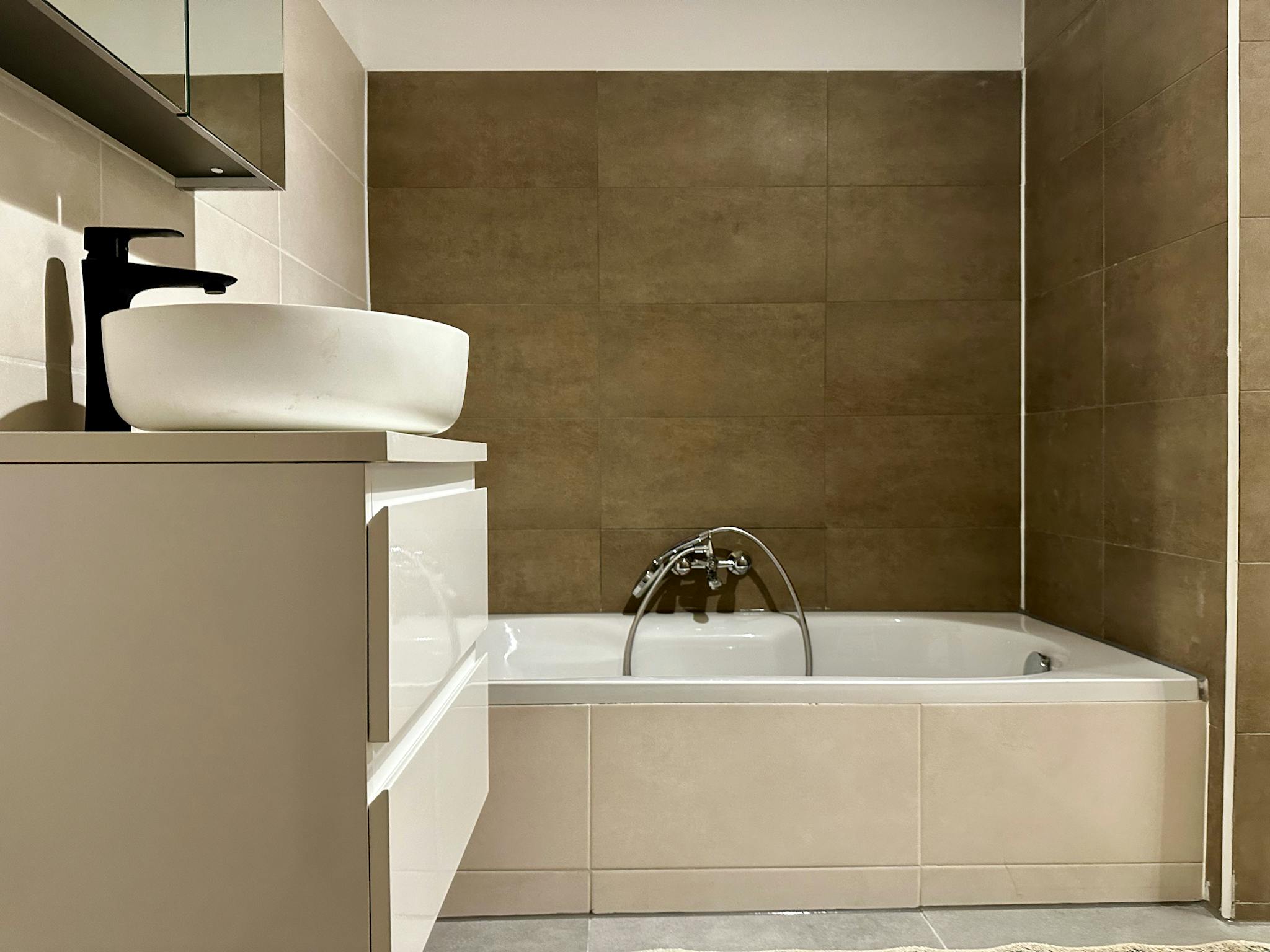 The closed kitchen is equipped with a dishwasher, oven and extractor hood. The bathroom has a walk-in shower, washbasin and a lovely bath. The toilet is separate as well as the space for the washing machine.