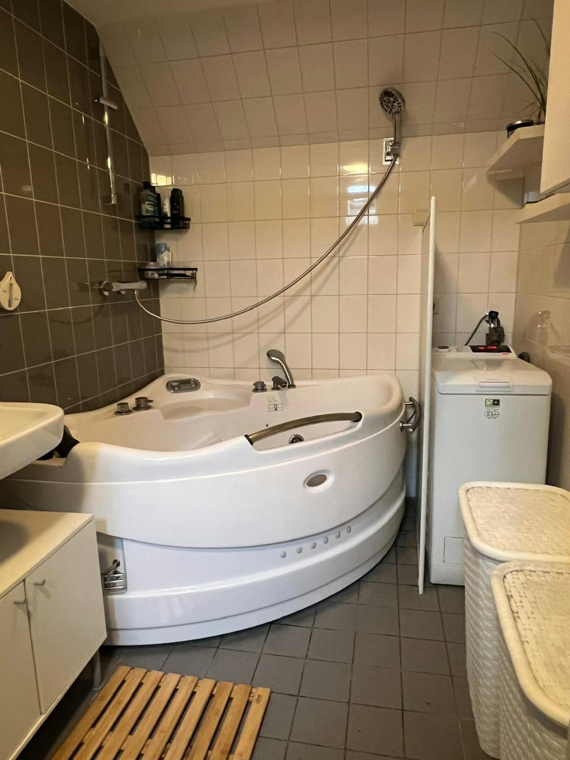 Downstairs, in addition to the living room and kitchen, there's a spacious balcony. The house also includes several wellness features, such as a massage chair and a jacuzzi. Use of these is included in the price, as is practically everything else in the house.