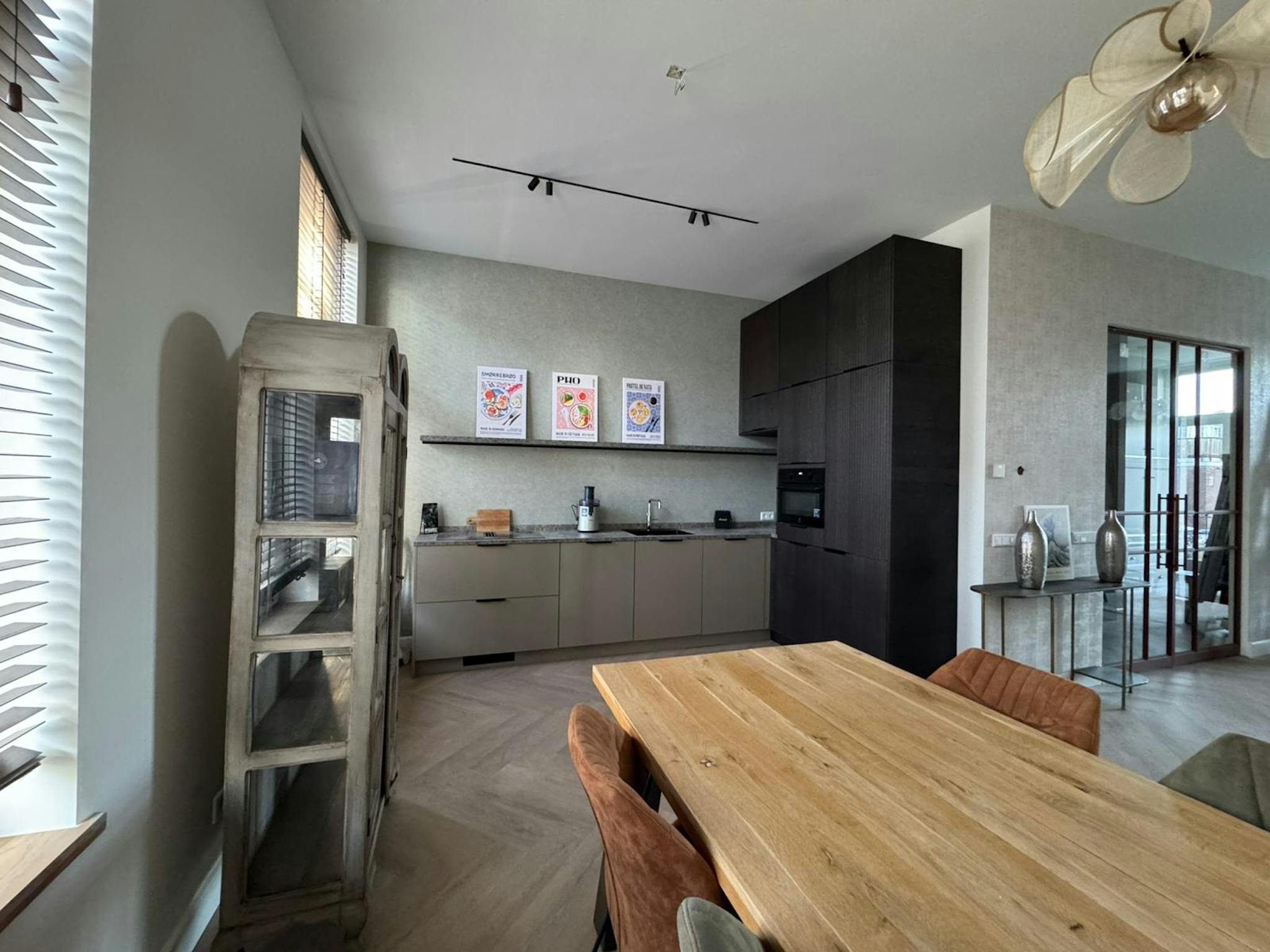 The modern kitchen is fully equipped and designed for everyday comfort and entertaining. It includes a complete modern setup and a large oak dining table, ideal for dinners, working from home, or hosting friends.