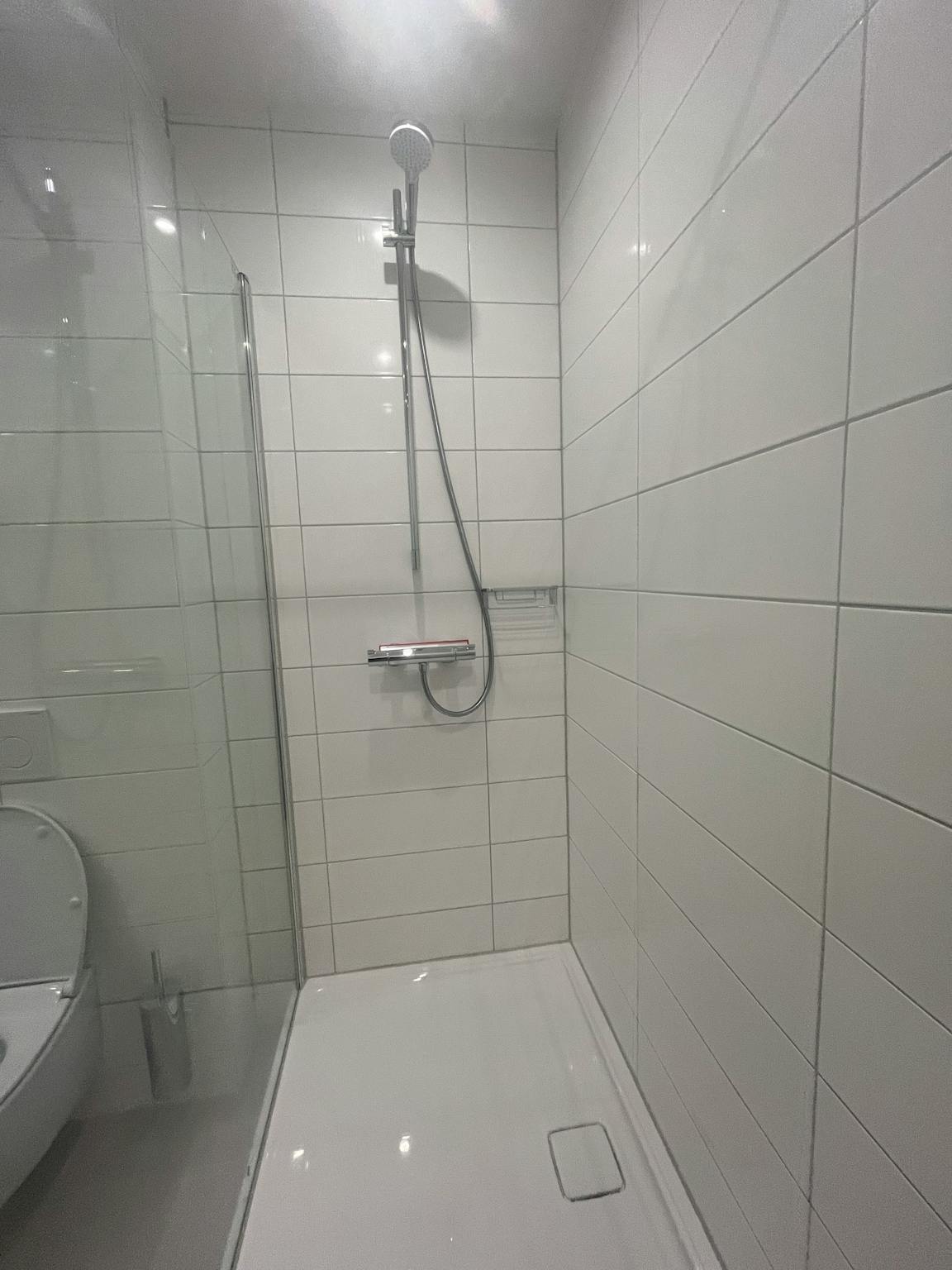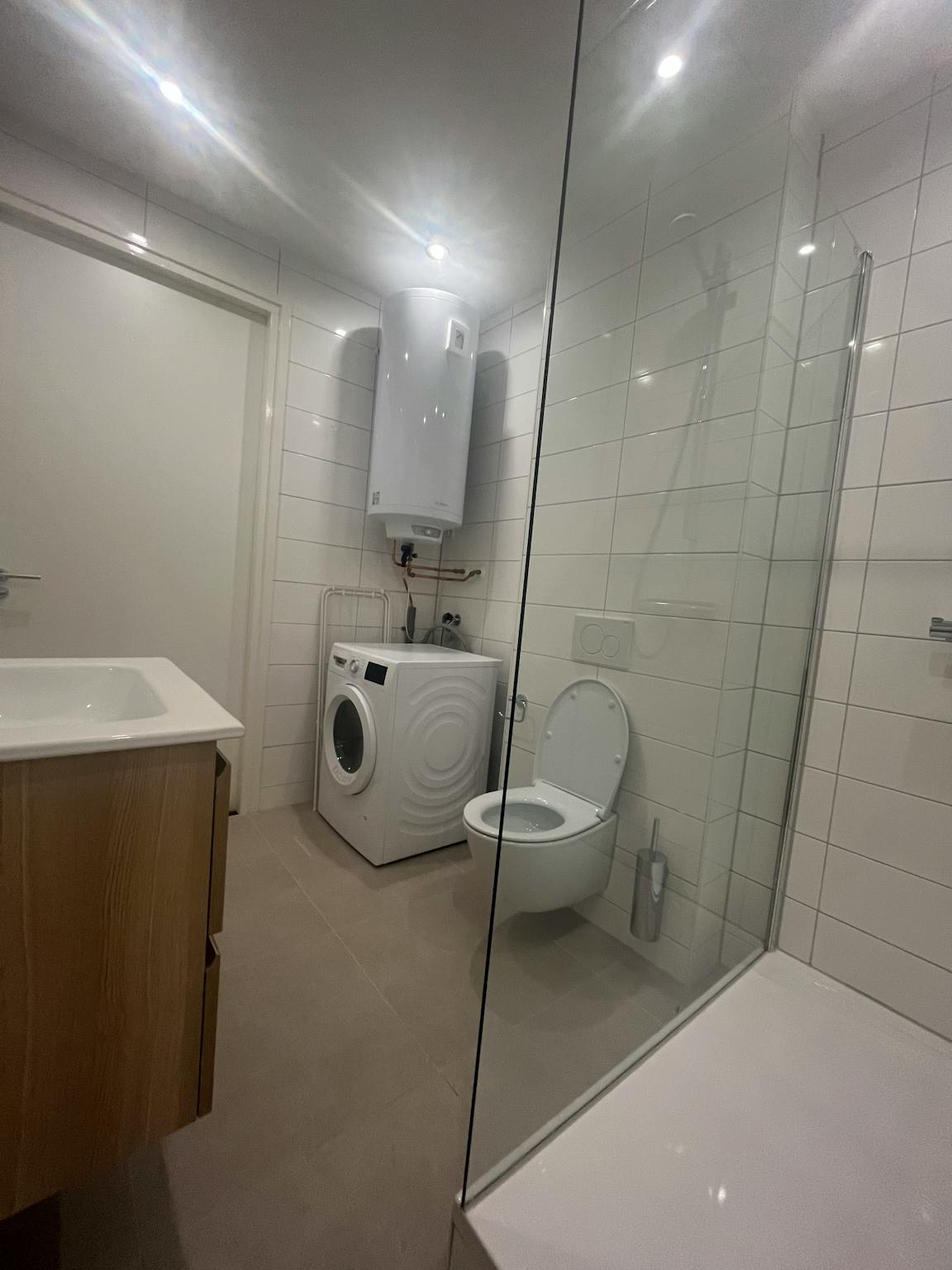 - Badkamer (6m2) voorzien van wasmachine, toilet, inloopdouche, elektrische designradiator en badkamermeubel met spiegel en onderkast.