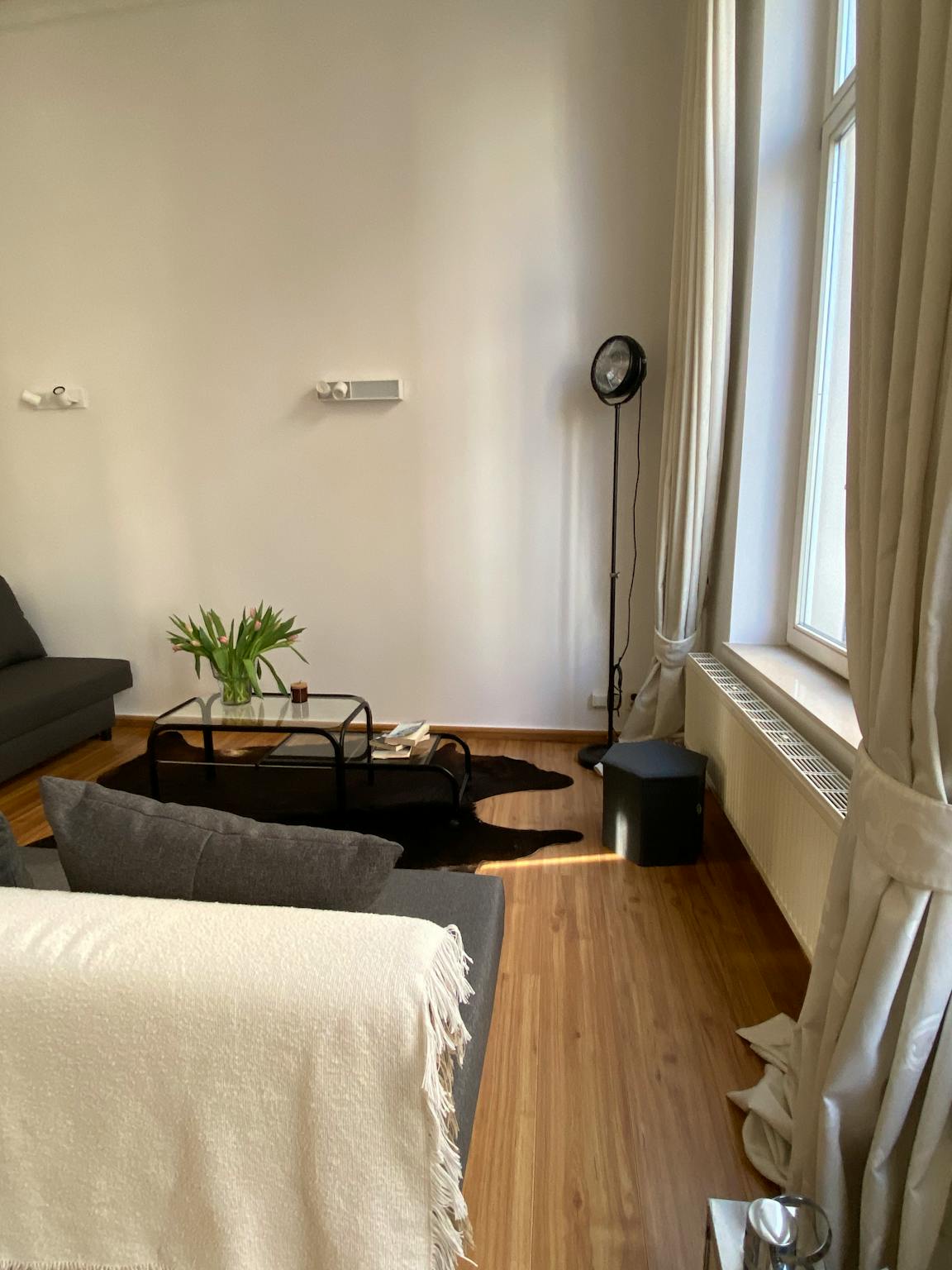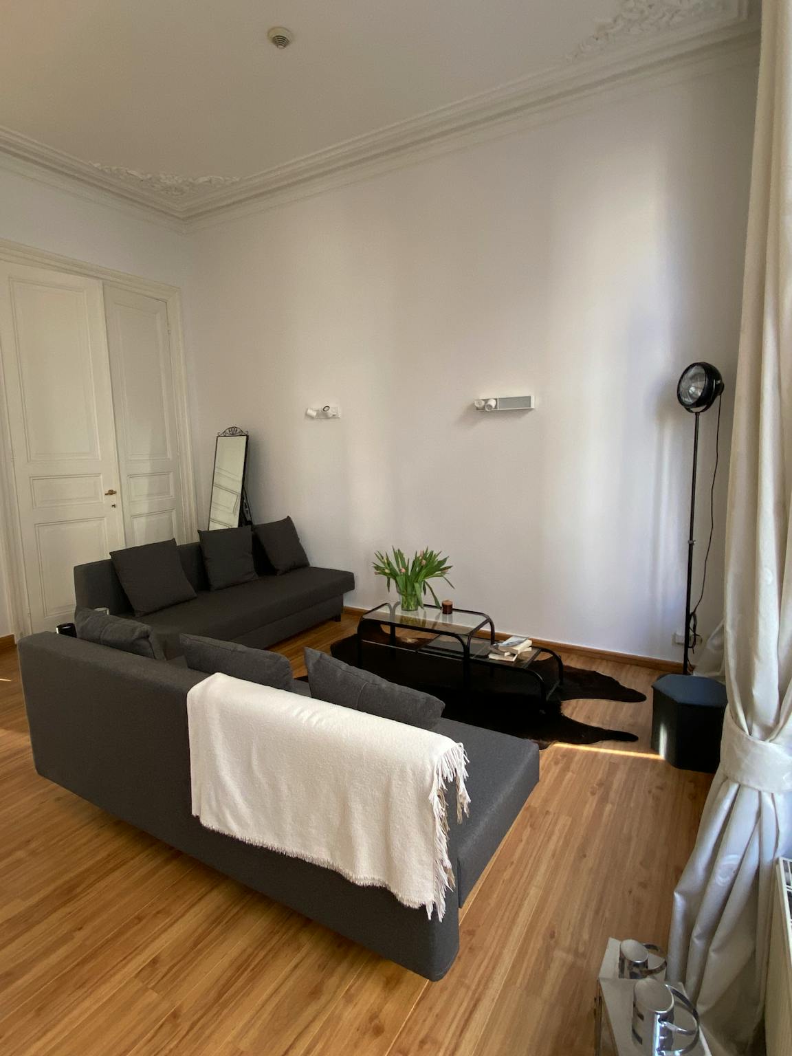 Entrance/hallway (approx. 2m2), renovated toilet room with floating toilet and sink, spacious living room with wall closet, laminate flooring, lots of light, bluetooth controlled lights in living room, large windows and a generous ceiling height of approx. 3.6m with various ornaments