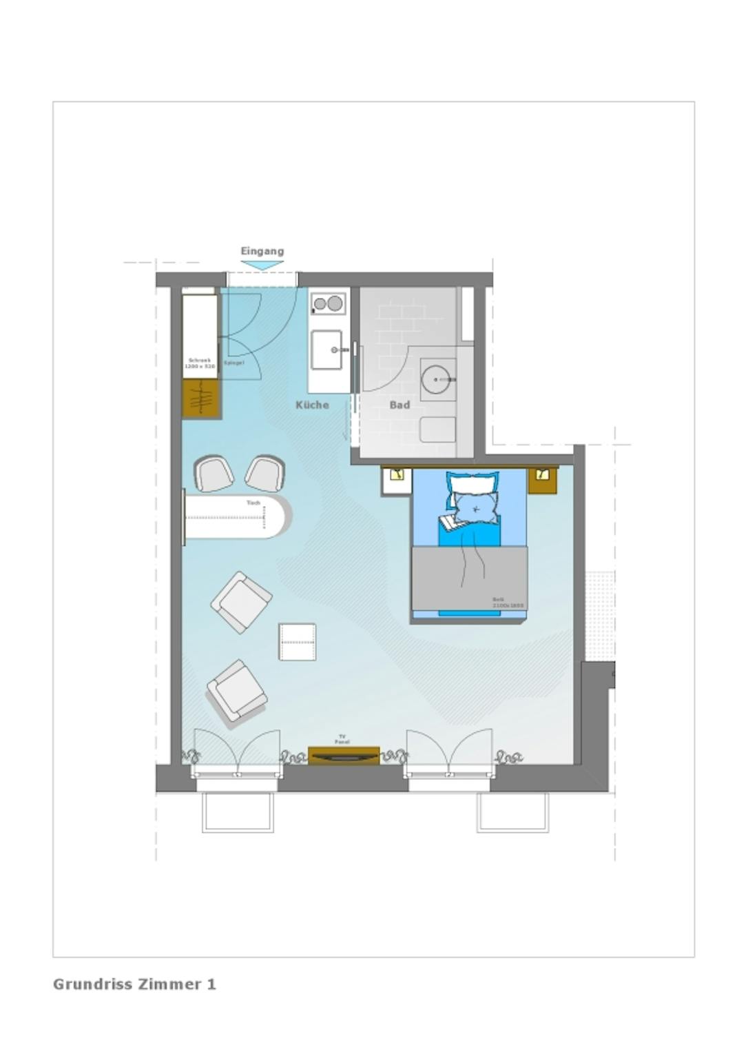 Non-SmokingNot allowedComfortable, south-facing apartment on the first floor! On 32 m2 you can feel like at home here. The bed width of 1.60 m, two cozy armchairs with a side table and an additional dining and working area easily allow you to stay longer, even for two people.