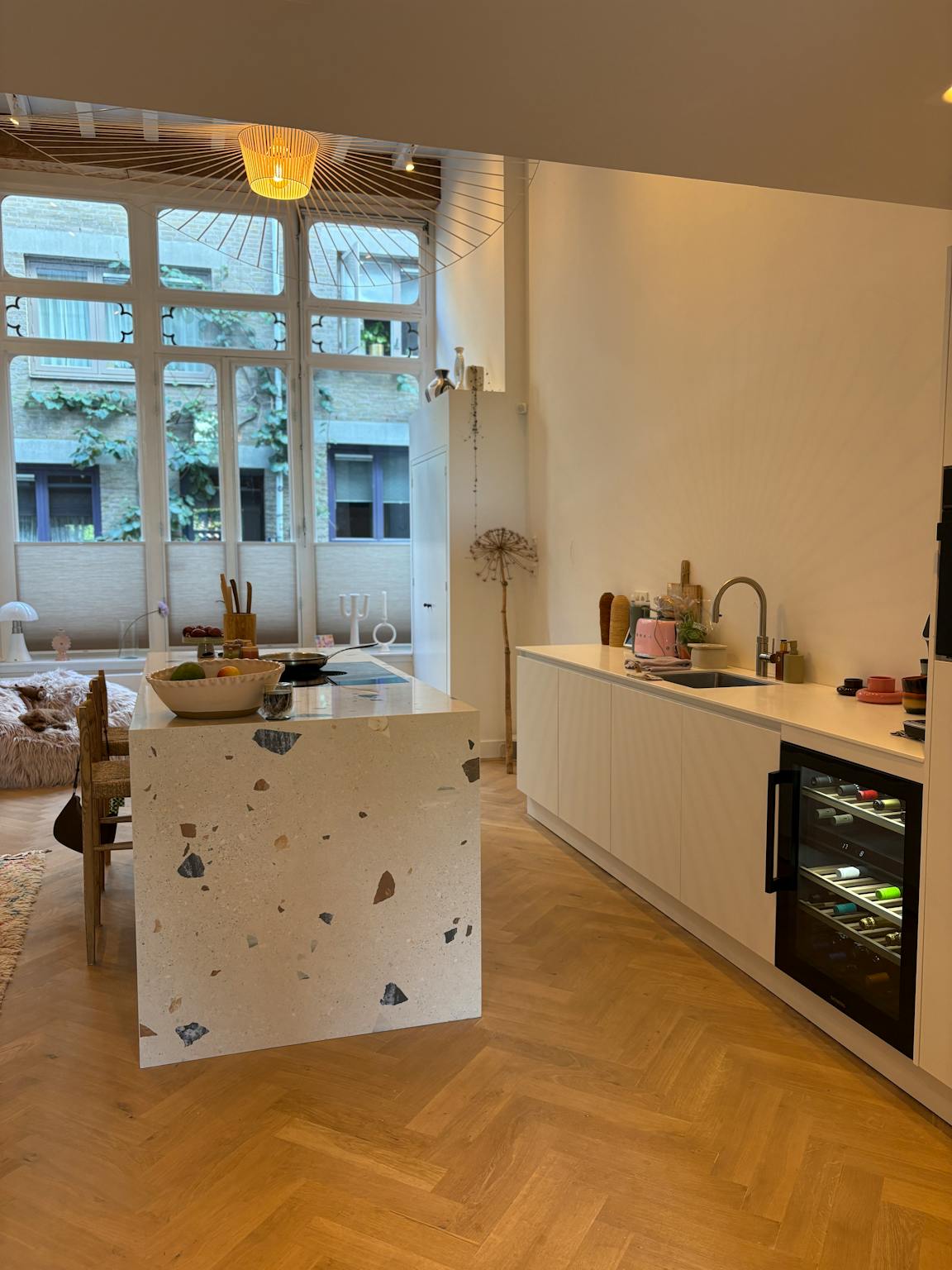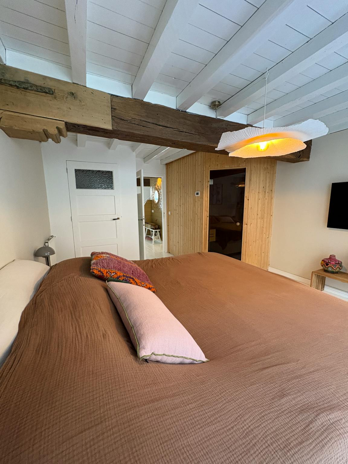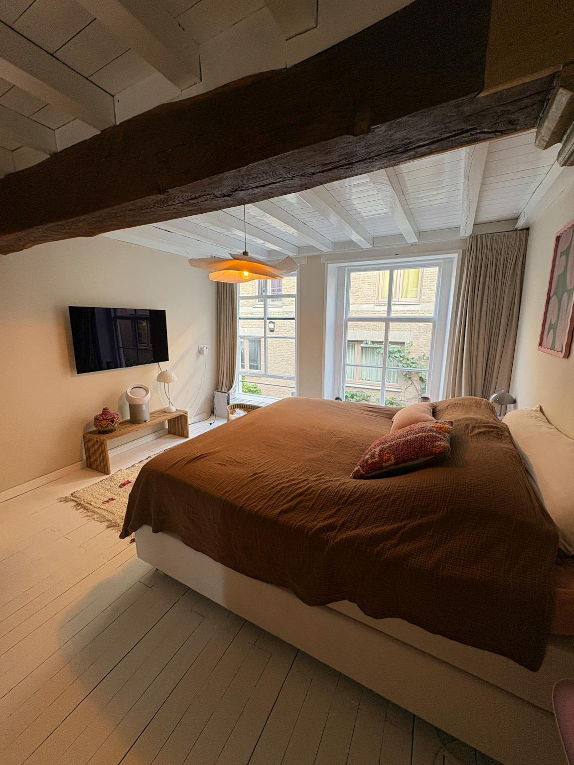 De ruime leefkeuken met kookeiland vormt het hart van het huis en is uitgerust met een Bora kookplaat, vaatwasser, combi-oven/magnetron, koelkast met vriezer, klimaatkast en Quooker. Dankzij de vide met vloerverwarming geniet je van een lichte, open sfeer, voorzien van een grote tv. Ook in de slaapkamer hangt een tv.