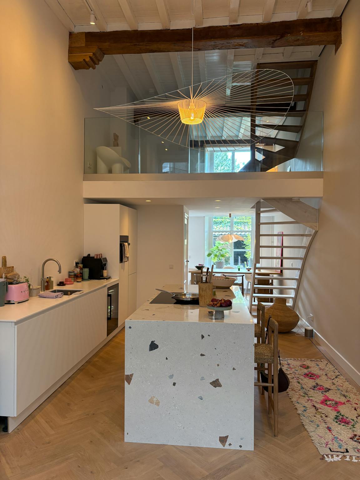 The spacious living kitchen with cooking island forms the heart of the house and is equipped with a Bora cooktop, dishwasher, combi oven/microwave, fridge with freezer, climate cabinet and Quooker. Thanks to the mezzanine with underfloor heating you can enjoy a bright, open atmosphere, equipped with a large TV. There is also a TV in the bedroom.