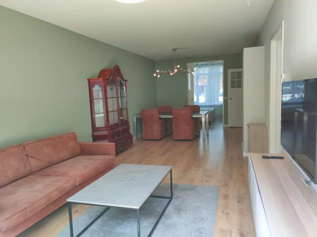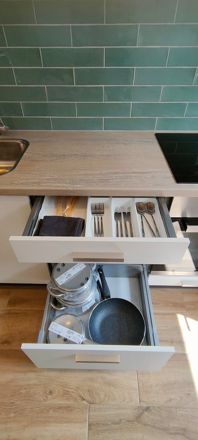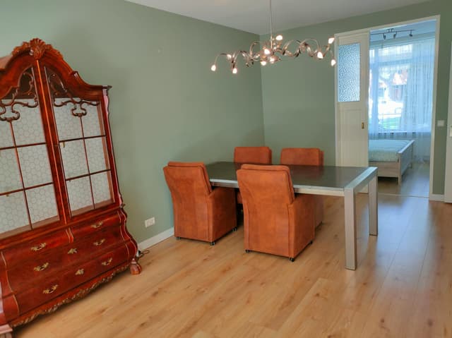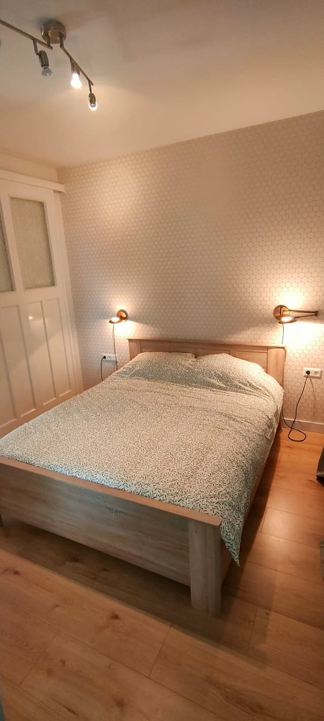 The living room is equipped with a sofa, table with chairs, cabinets and Television. The bedroom has a twin bed with sufficient storage space for clothing. The bathroom has a rainshower and cabinet with mirror and there is a seperate room where the washing machine and dryer are located. Theres a separate stoilet. The kitchen is equipped with a dishwasher, fridge and freezer, oven and induction stove.