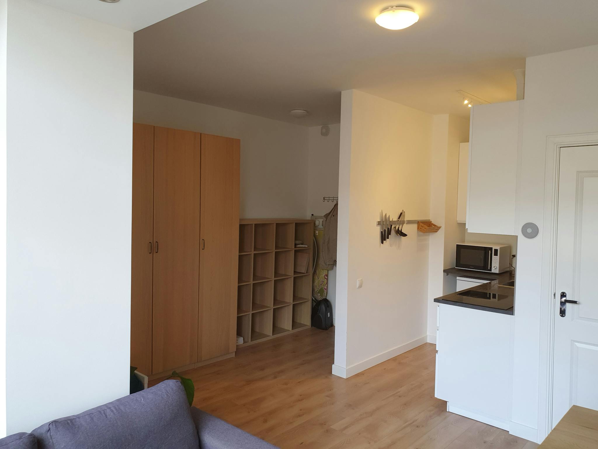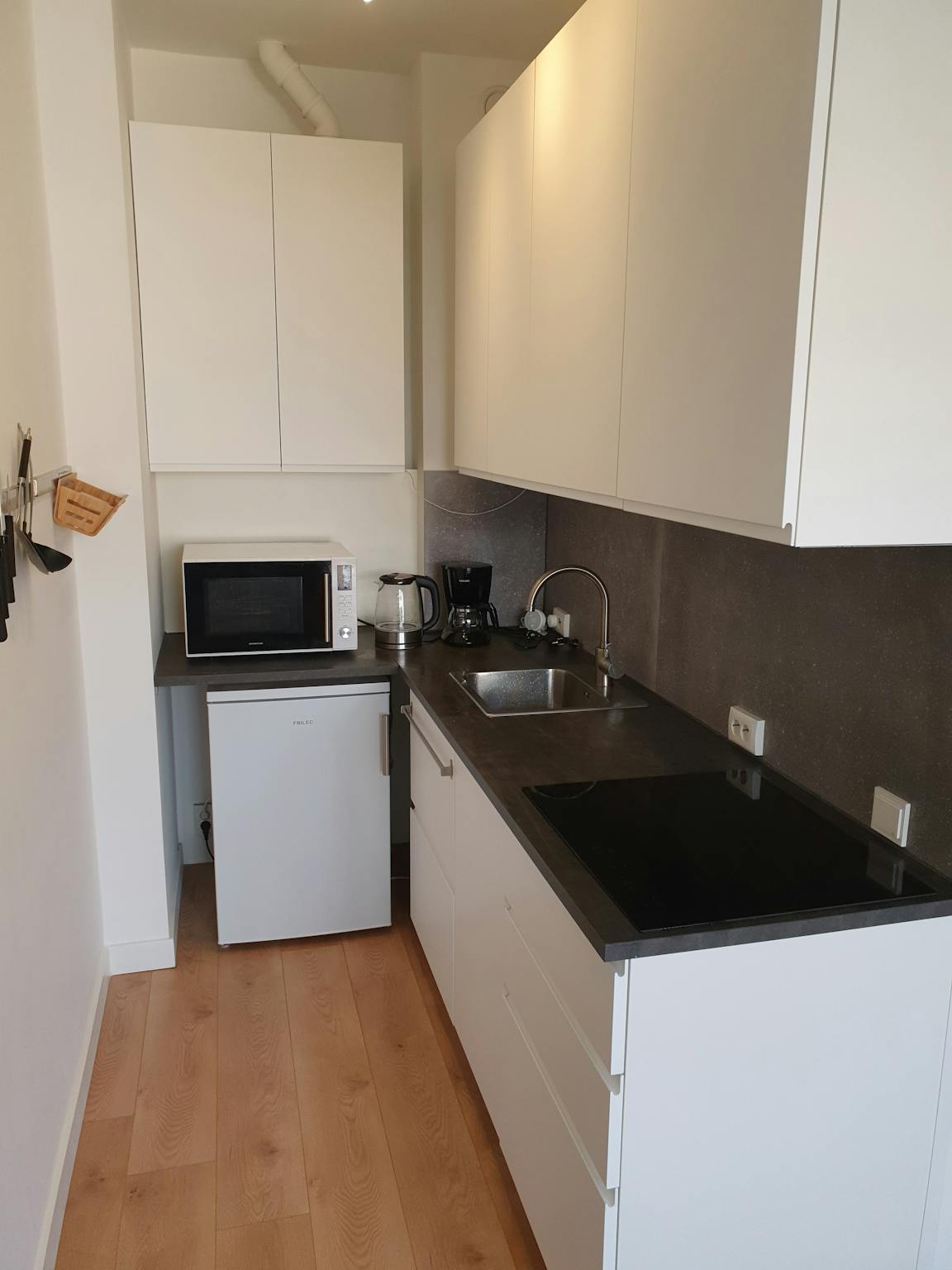 The apartment has a bathroom with rain shower and toilet. The kitchen is open and connected with the rest of the studio.