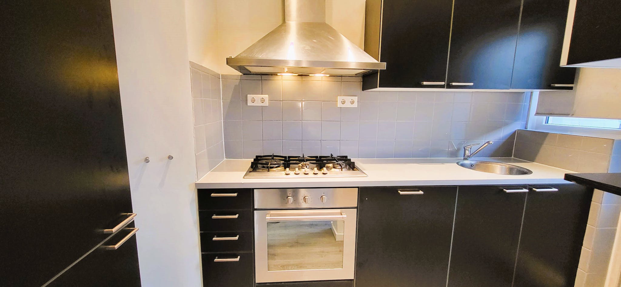 Modern Kitchen: Stylish black detailing, oven, and gas stovetop.