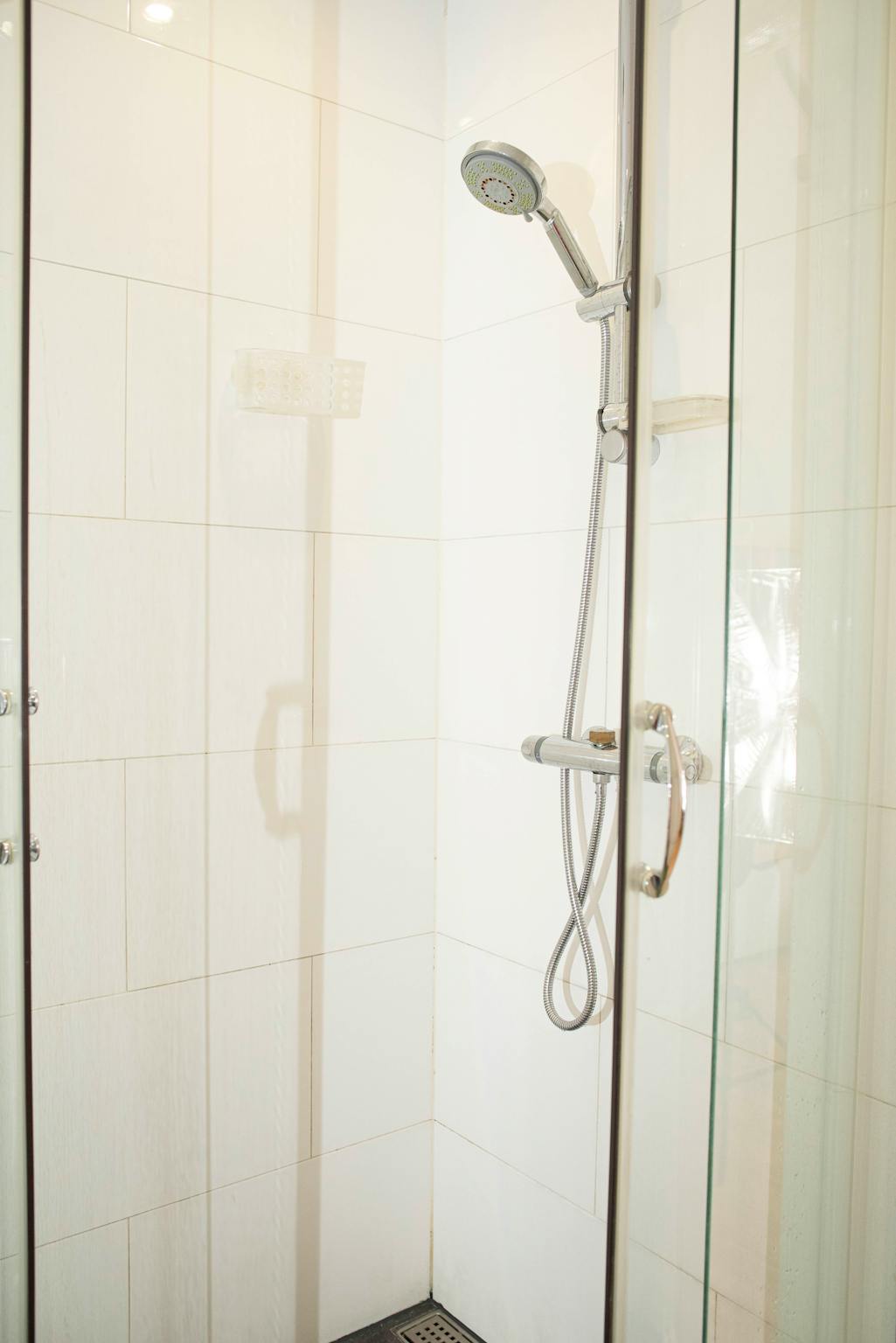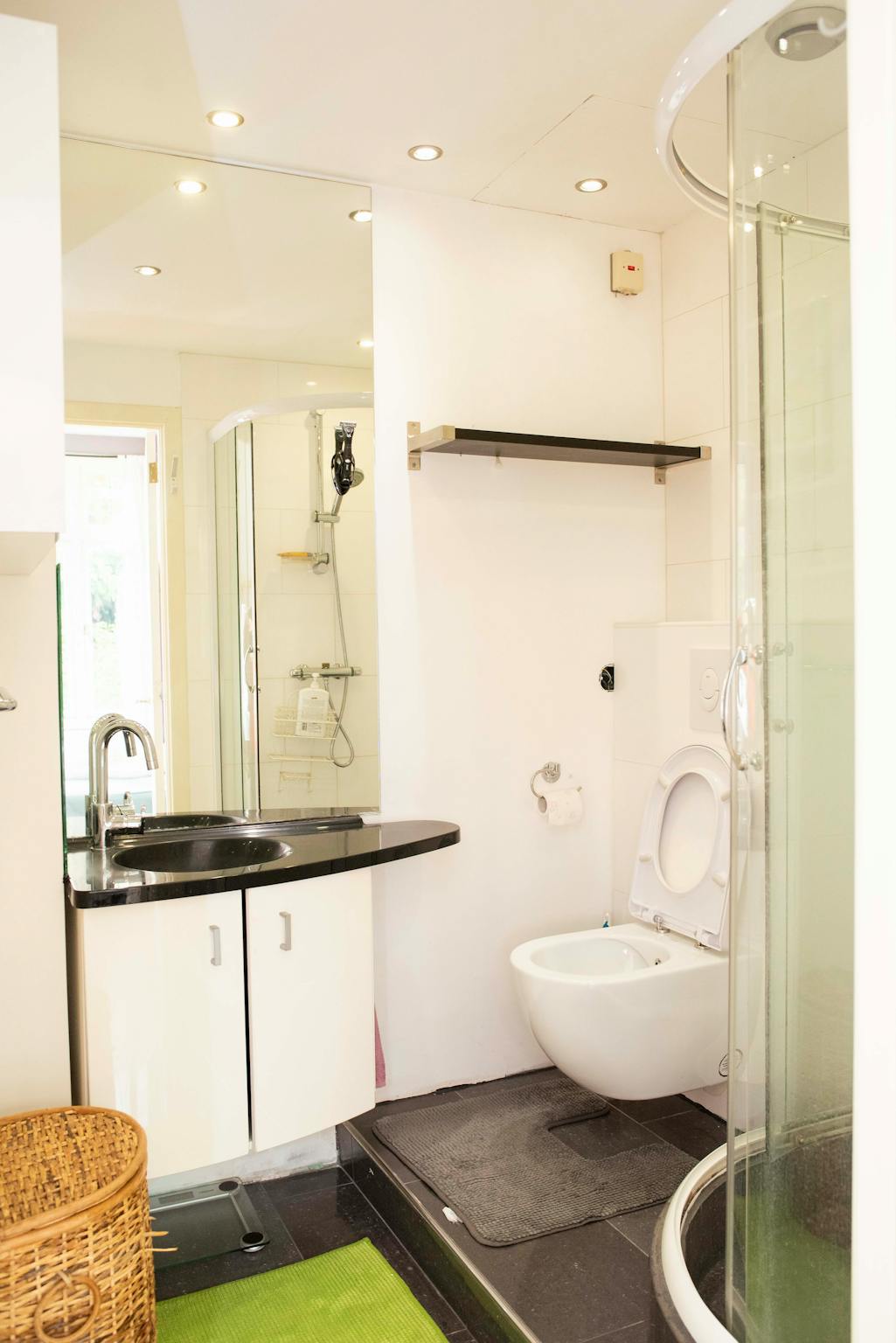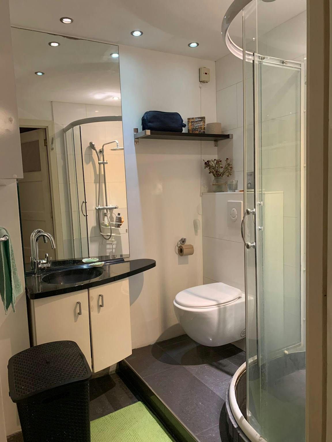 - bathroom with shower, washbasin, toilet, cabinet, mirror.