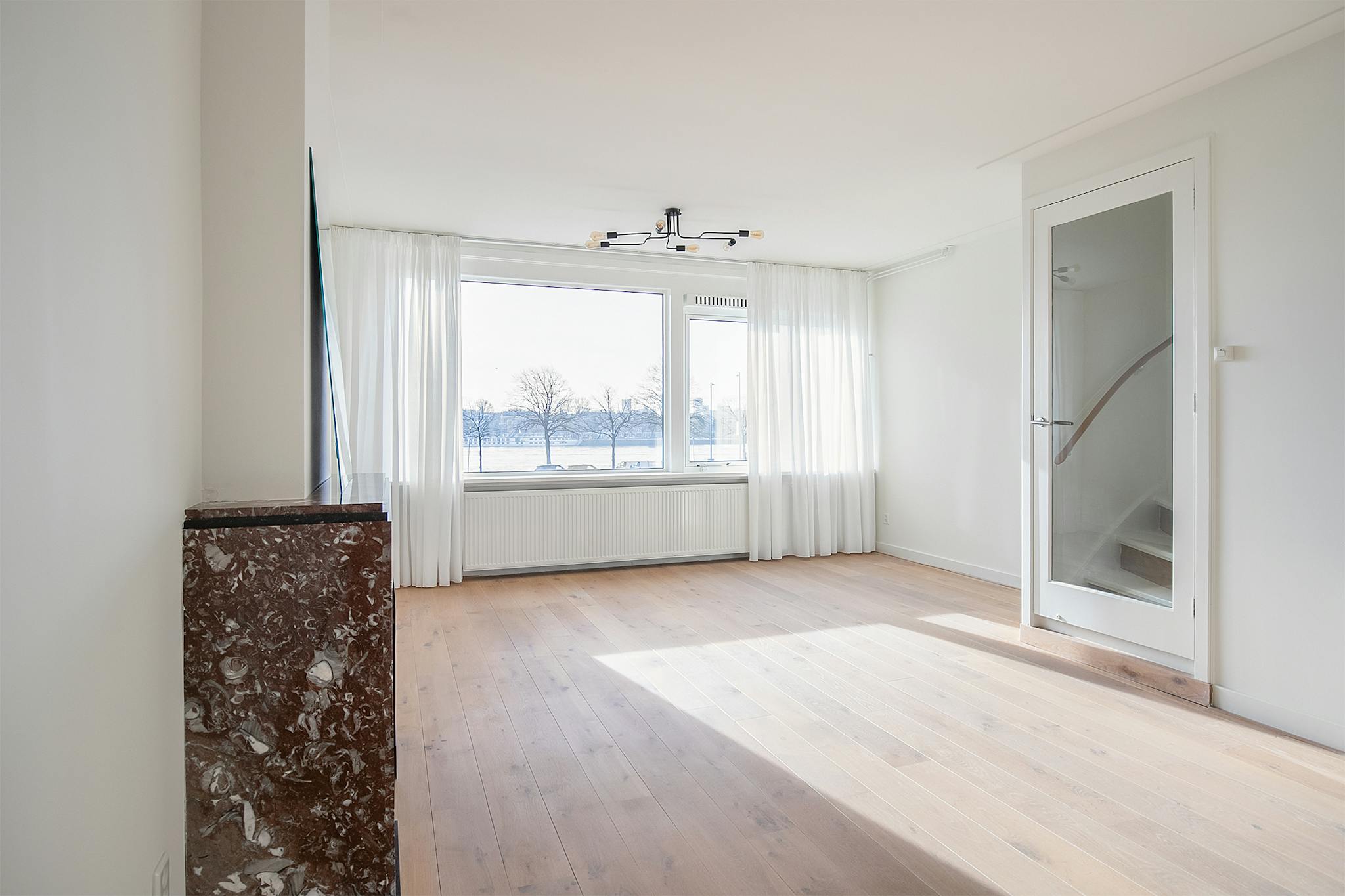 The air-conditioned bedroom and dressing room provide access through a door to the south-facing balcony, with an unobstructed view of Maasboulevard, the Maas river, Rotterdam South and the Esch.