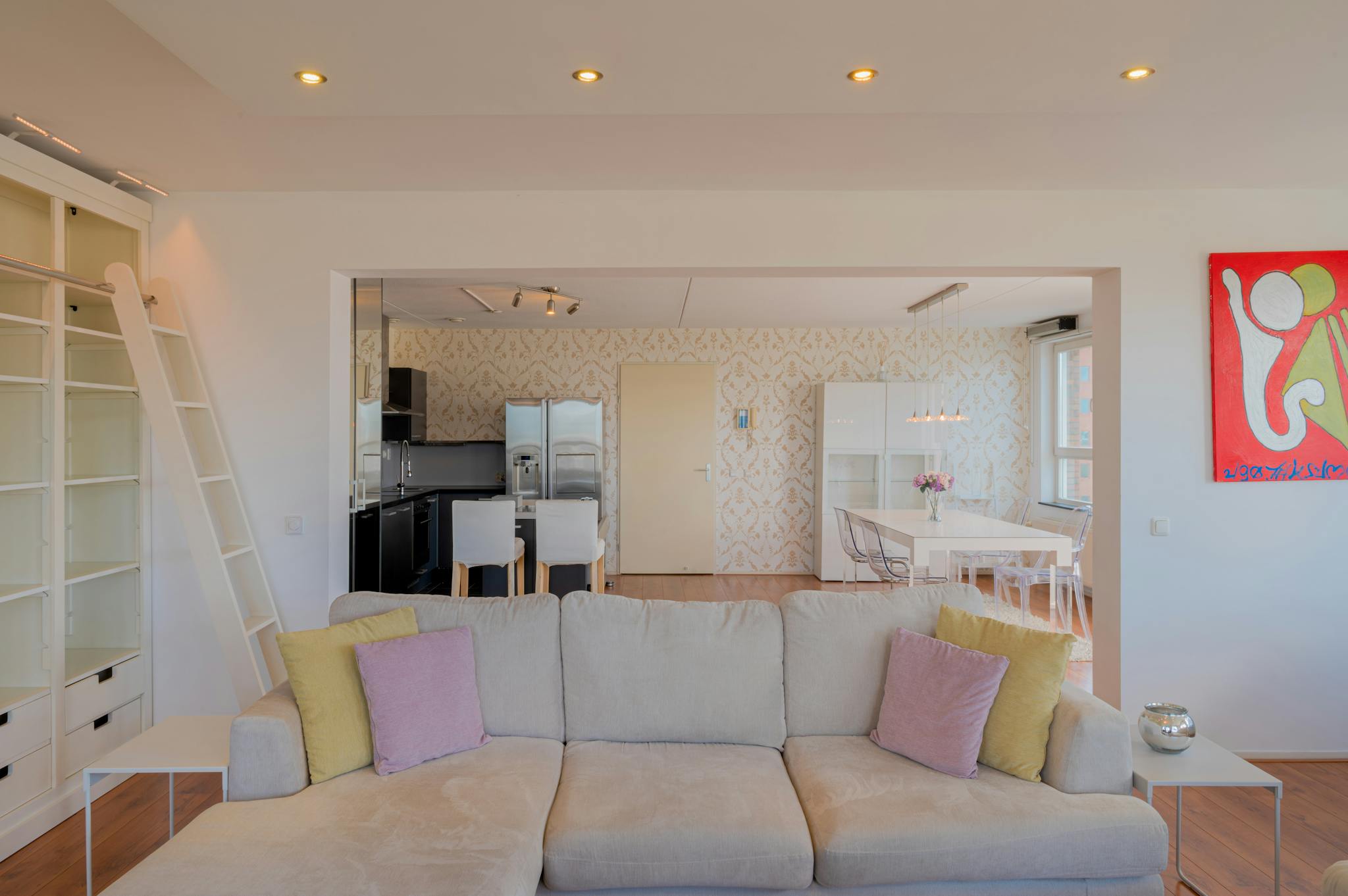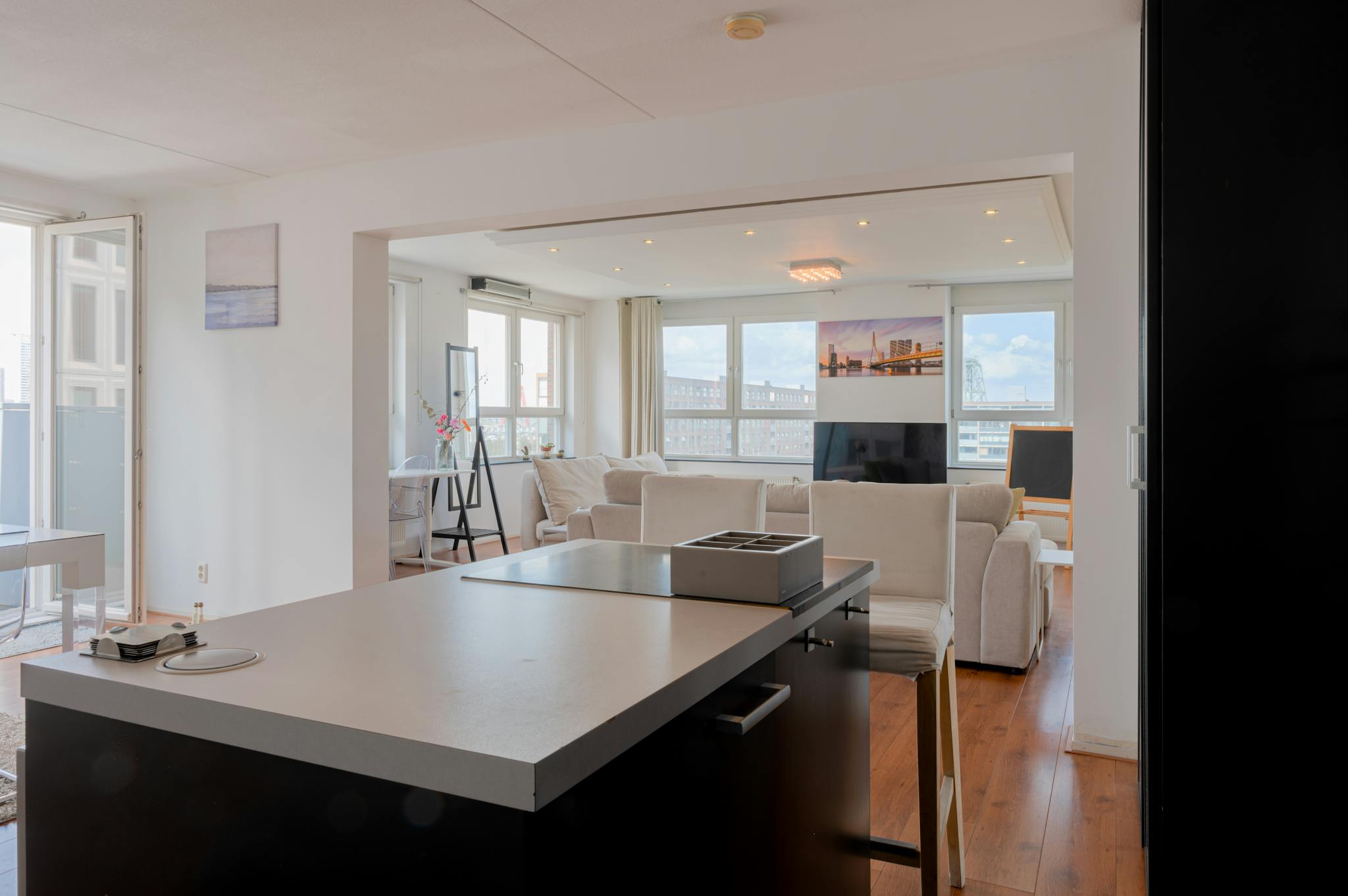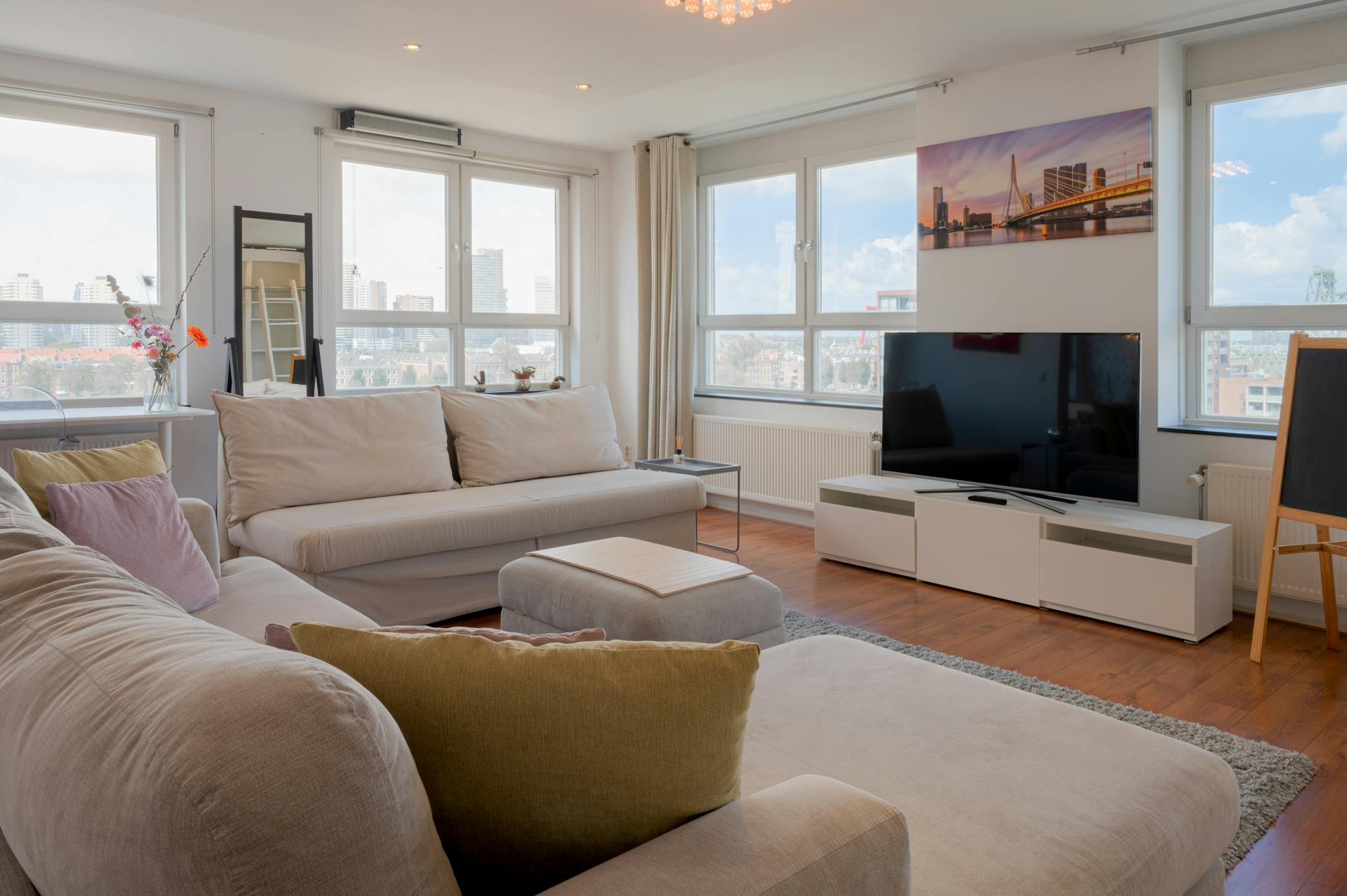 Non-SmokingNot allowedThe spacious corner apartment with balcony on the top floor is about 119 square meter and has a beautiful panoramic view. It’s located at Ernest-Groosmanplein in Rotterdam, next to famous Erasmus Bridge.
