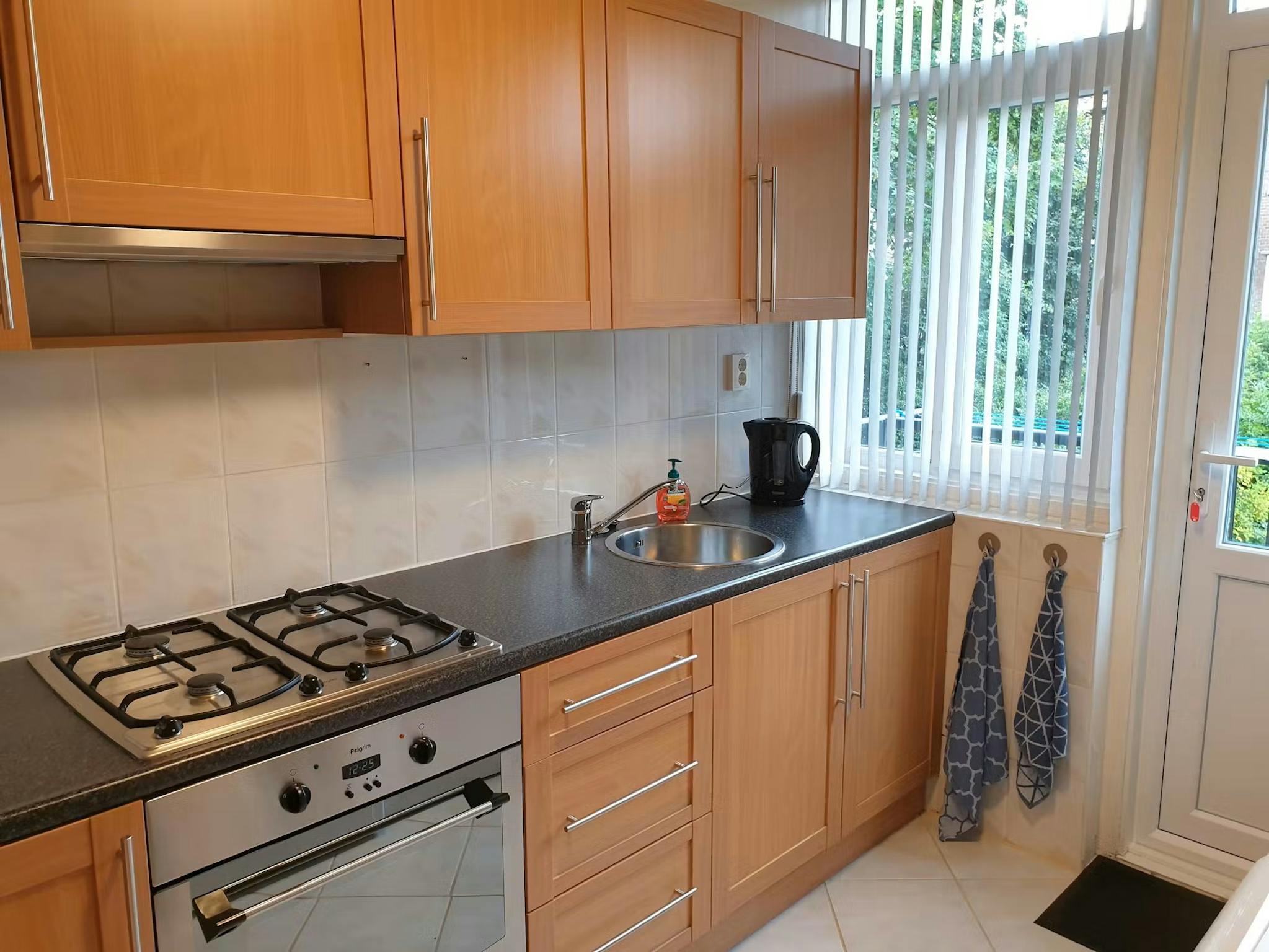 Shared sitting area and kitchen, which consists of fridge, freezer, gas stove, oven, microwave, washing machine and dishwasher.