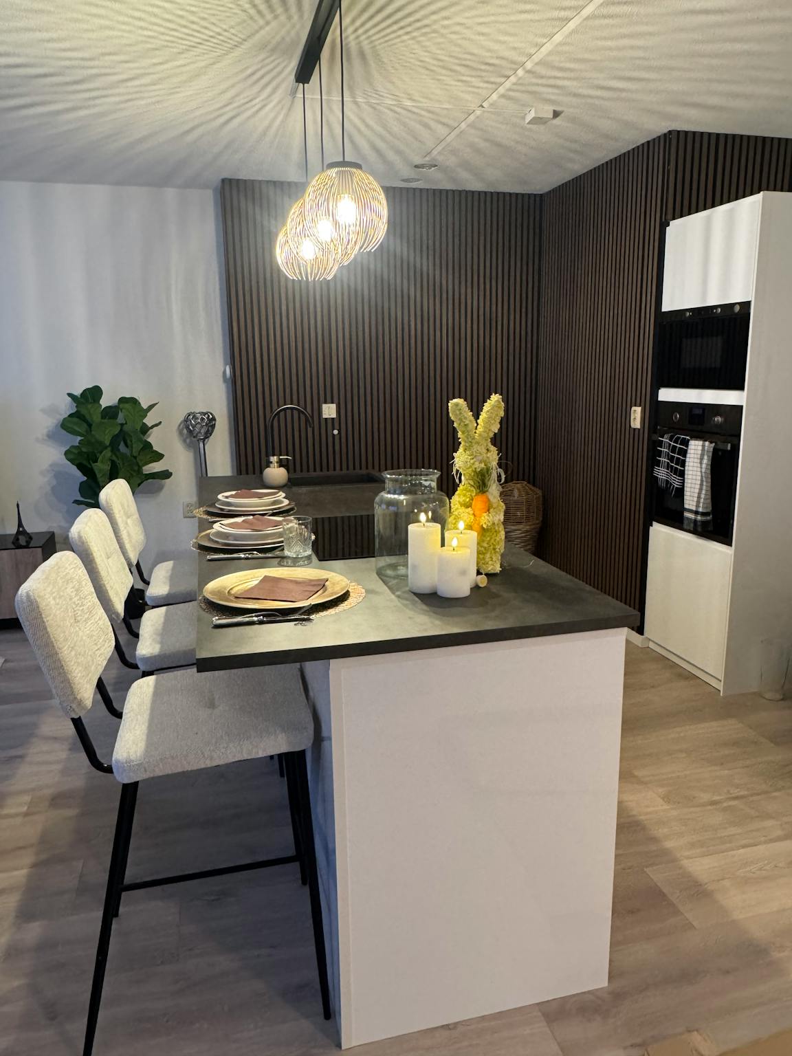 The L-shaped living room is bright and comfortable, and is connected to an open kitchen with a cooking island. The dining area features a round table with four chairs, and the living area includes a comfortable sofa and a large TV mounted on the wall.