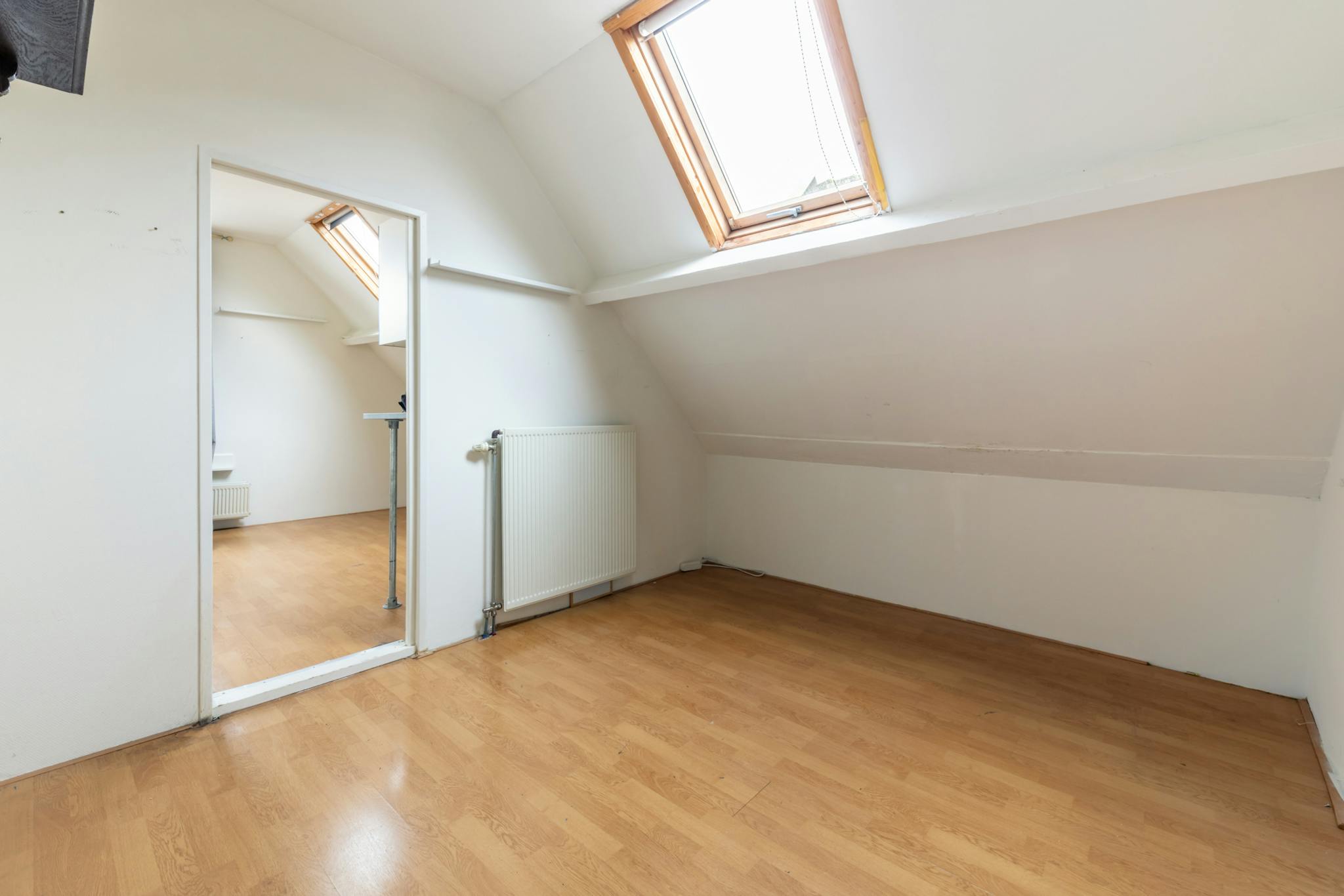 Overloop met toegang tot meerdere slaapkamers. Aan de voorzijde bevindt zich een ruime slaapkamer, aan de zijkant een tweede slaapkamer en aan de achterzijde een derde slaapkamer, welke bereikbaar is via een tussenkamer. De badkamer is volledig betegeld en uitgerust met een douche, wastafel en toilet.
