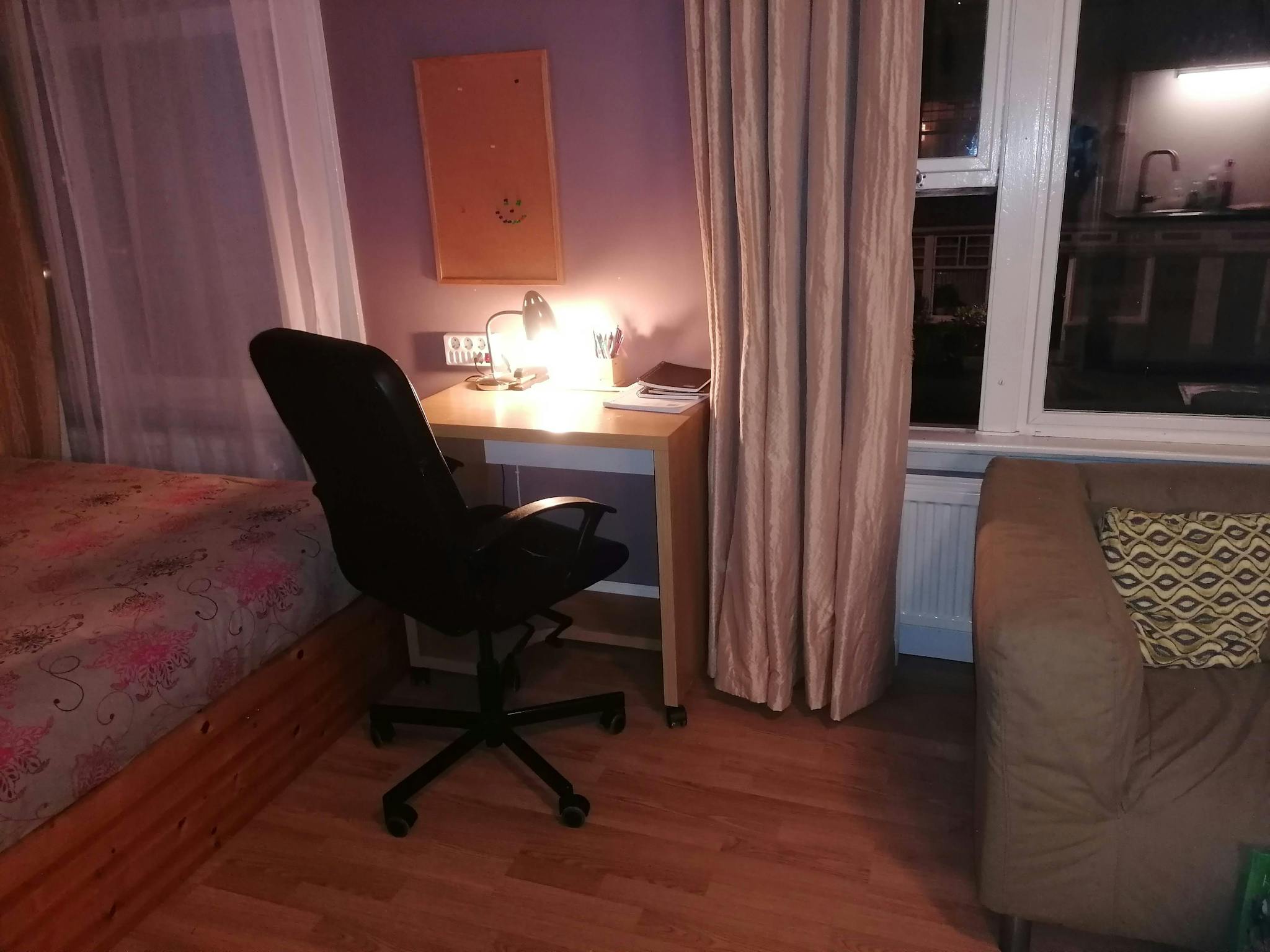 kitchen (refrigerator with freezer compartment, stove top, sink, wasching machine, microwave/oven, cabinets, etc.), - bathroom (with shower, washbasin, - toilet, - there is a table, chair, big closet, double bed, - residential registration is possible. - There are public parking places in the street in front of the house.
