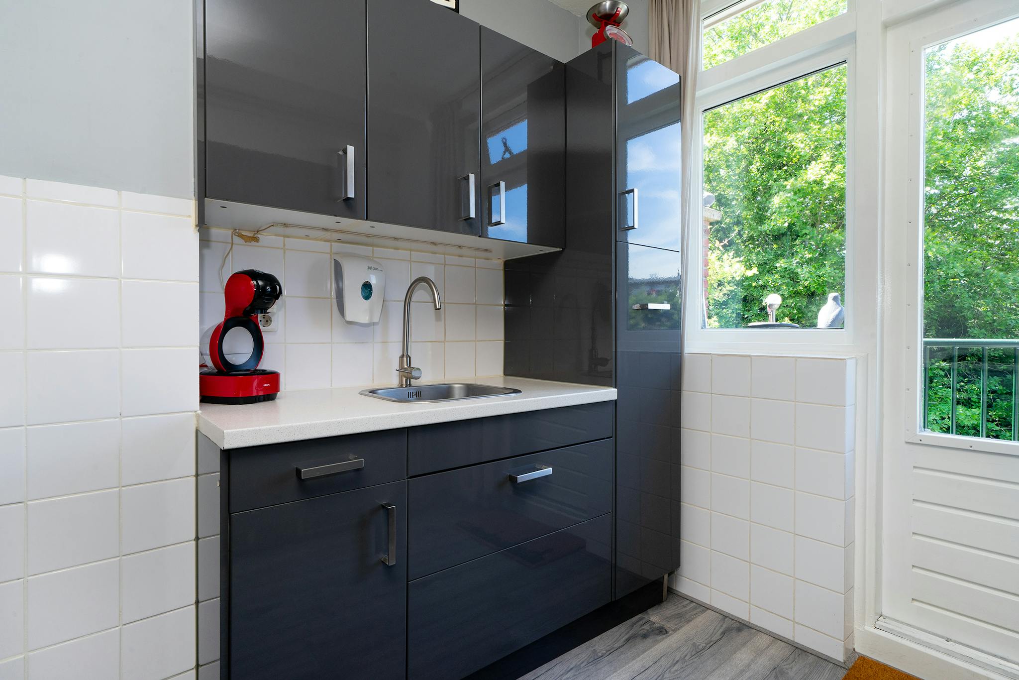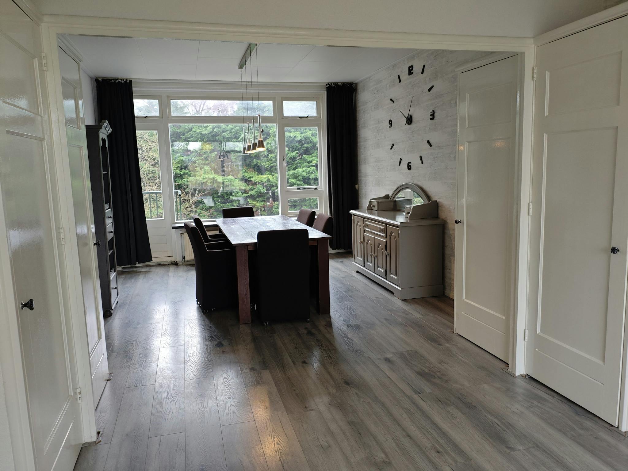 Bright living room with laminate flooring and acces to the large balcony. The living area in the front, with views on the watersite, the dining area is at the backside with views on the gardens.